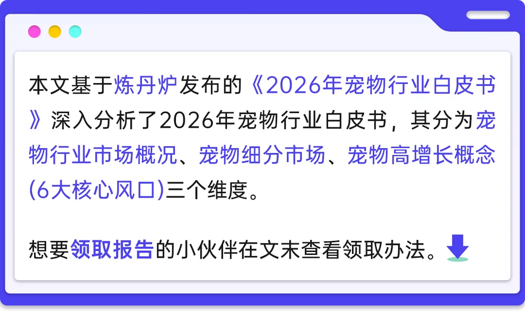 以上就是《2026年宠物行业白皮书-炼丹炉》分析报告,篇幅有限,获取完整版报告欢迎公众号后台回复“领取报告”获取。