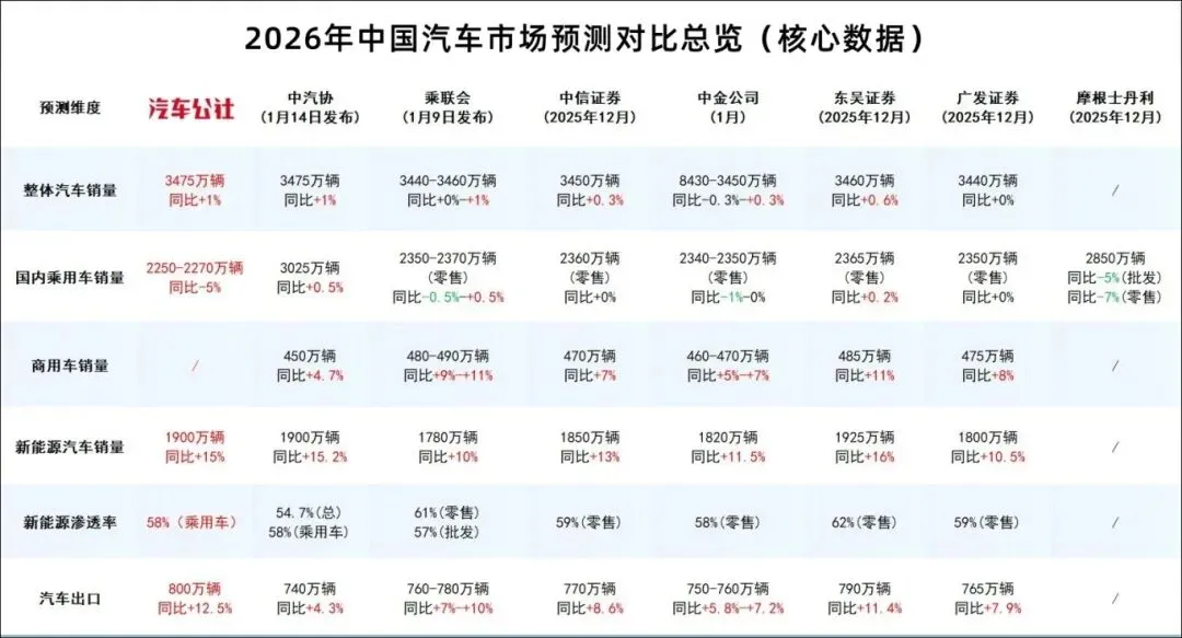 从国内的官方机构到国外的权威研究机构都为2026年的车市可能下跌做好了足够铺垫。最乐观的乘联会也只是小心翼翼地框定2026年车市1%的增幅,而最糟糕的预测值断言中国车市将在2026年跌去7%。绝大多数预测值都放在下跌3%~5%的负增长区间内。