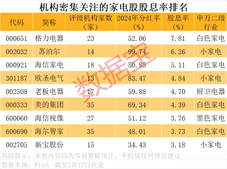 具体到A股市场上的投资机会而言,高股息率的优质公司长期表现值得观察。数据显示,10家以上机构评级的家电股中,格力电器、苏泊尔、海信家电等个股股息率均超3%。从分红率角度来看,苏泊尔2024年分红率接近100%,居首。
