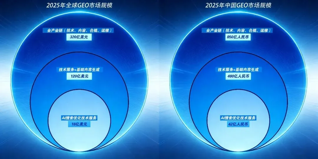 全球市场:纯AI搜索优化技术服务规模达18亿美元;涵盖技术服务+基础内容生成的综合市场规模,已突破120亿美元;按全产业链(技术、内容、合规、运维)统计,规模有望突破320亿美元