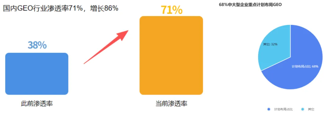 需求端:用户行为变迁催生刚性需求,60%的搜索请求已通过语音或长文本对话形式完成,AI生成答案的覆盖率超40%,企业营销焦点从传统SEO加速向GEO迁移,需求也从“广谱覆盖”转向“精准化、定制化适配”。