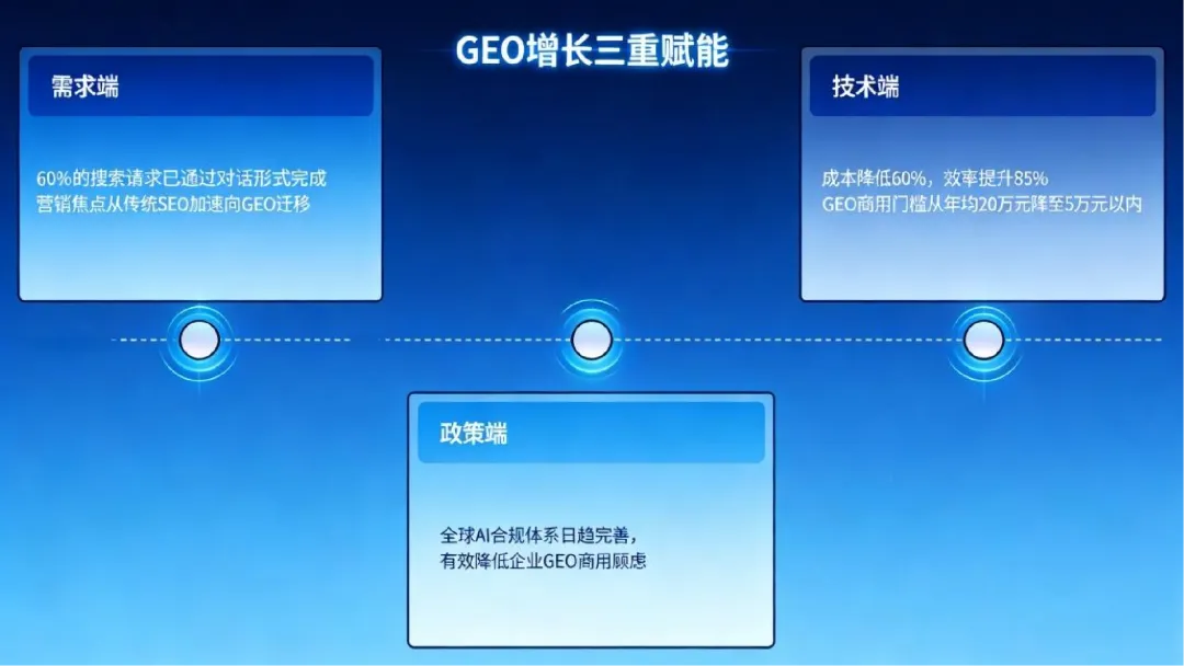 技术端:三大核心技术突破彻底打破GEO商用瓶颈——大模型轻量化使部署成本降低60%,大幅降低中小微企业的布局门槛;多模态交互技术升级使转化效率提升85%;合规算法日趋成熟使行业合规问题发生率降低72%,提升品牌商用信心。同时,轻量化SaaS方案的普及,使中小企业GEO商用门槛从年均20万元降至5万元以内,进一步释放市场需求。