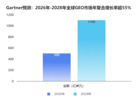 市场规模持续爆发,增长红利集中释放:据Gartner预测,2026年全球全产业链GEO市场规模将突破500亿美元,2028年有望跃升至1100亿美元,年复合增长率维持在55%以上;中国市场2028年全产业链规模将突破3200亿元,其中跨境电商、金融、医疗三大垂直领域占比将达60%以上,成为GEO行业的核心增长极,越早布局,越能抢占增长红利,构建竞争优势。