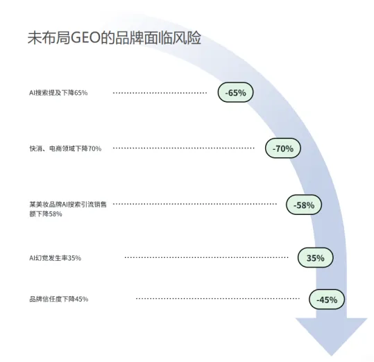 流量流失风险:据Forrester调研数据,2025年全球已有40%的传统品牌,因未布局GEO,AI搜索提及率较2024年骤降65%,核心流量被已布局GEO的竞品抢占;其中,快消、电商领域品牌流量流失最为严重,平均流失率达70%以上;某全球知名传统美妆品牌,因滞后布局GEO,2025年AI搜索引流的销售额下降58%,市场份额被竞品超越,逐步丧失行业话语权。