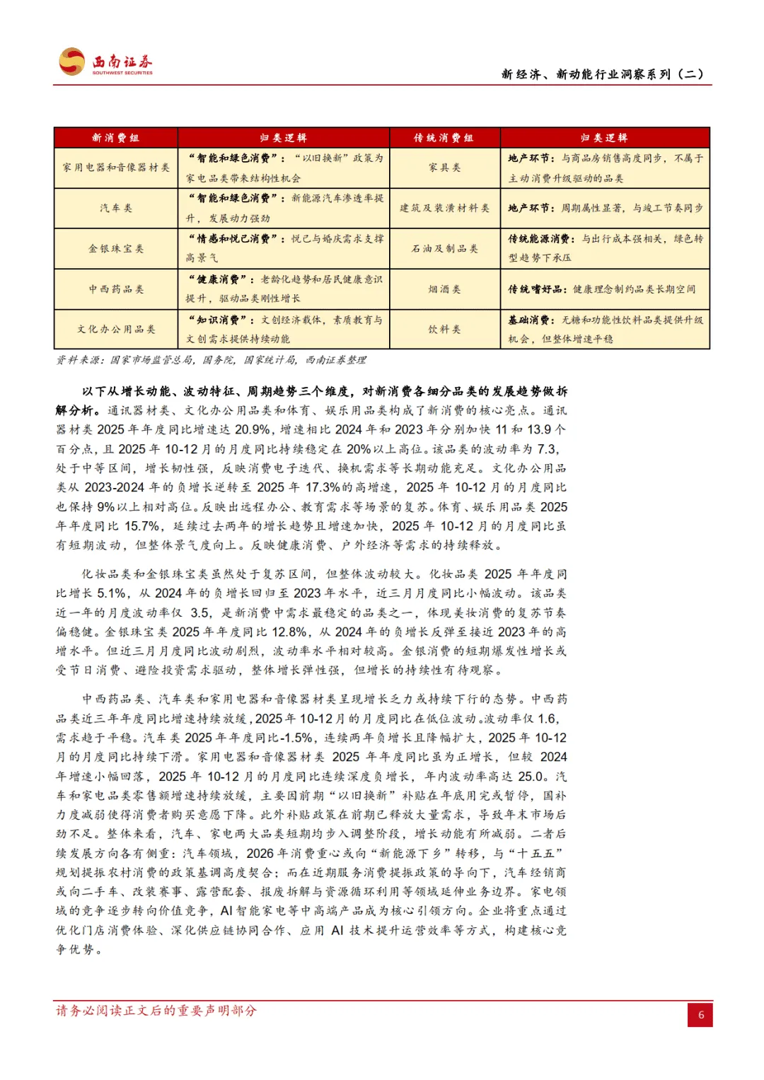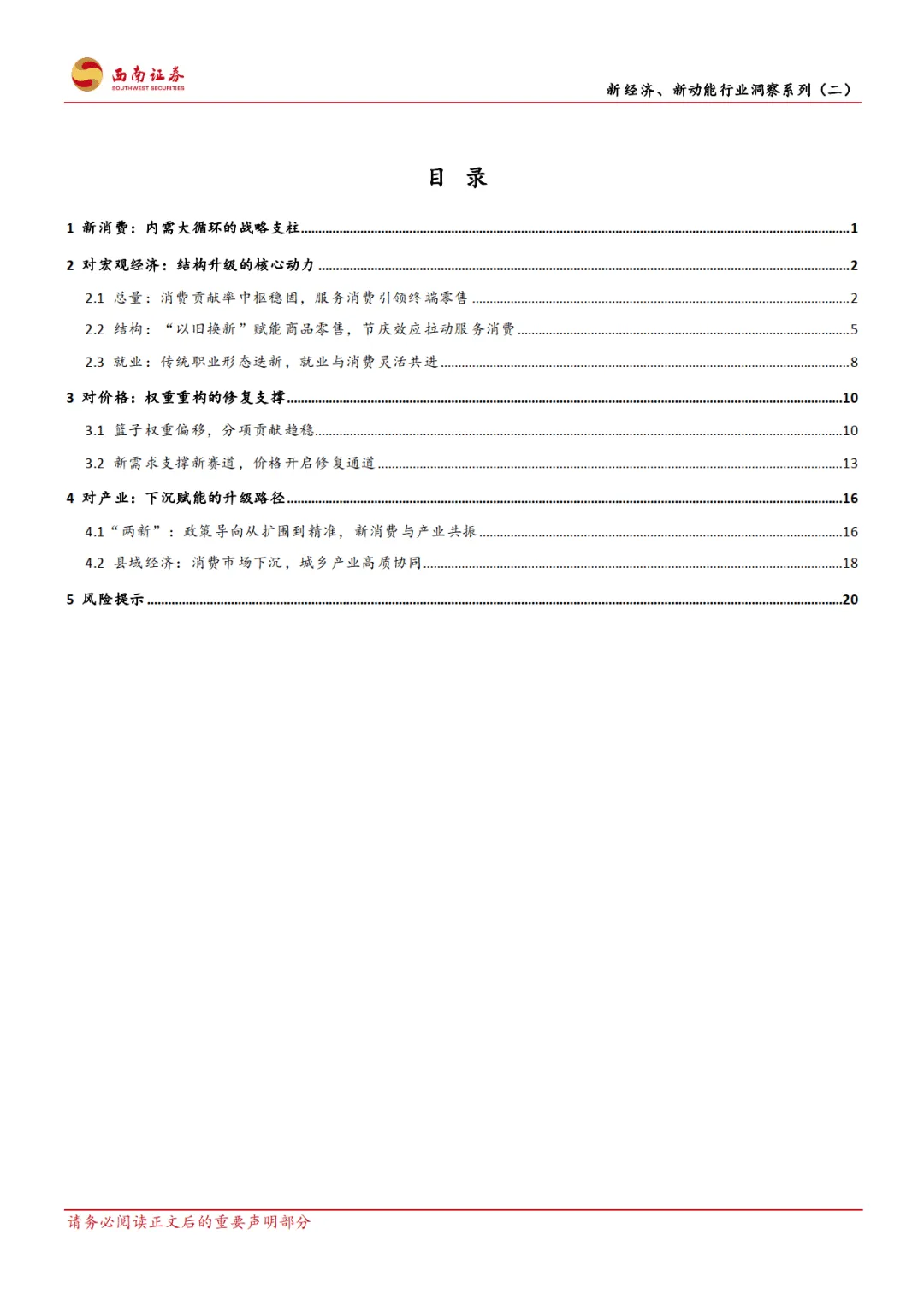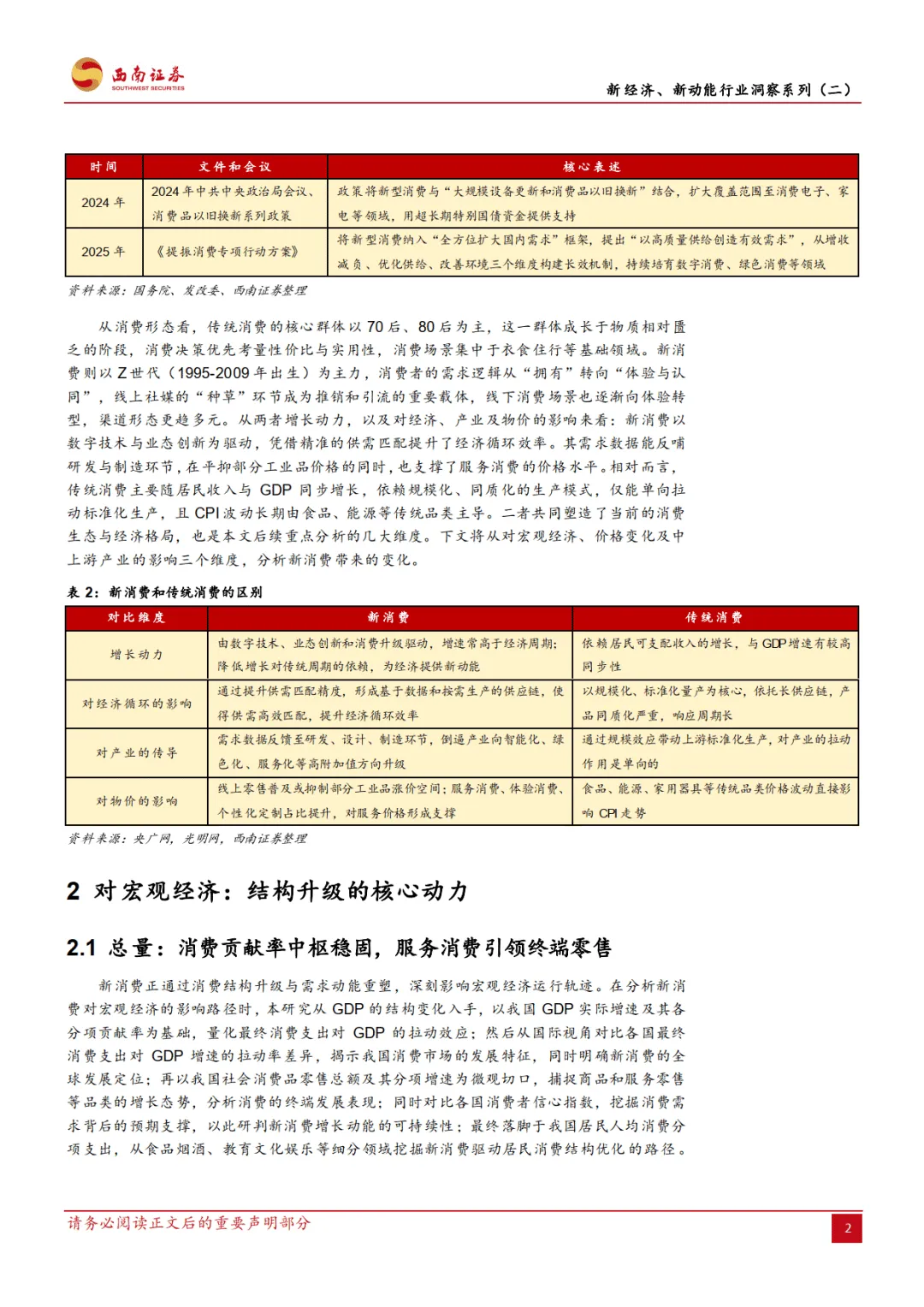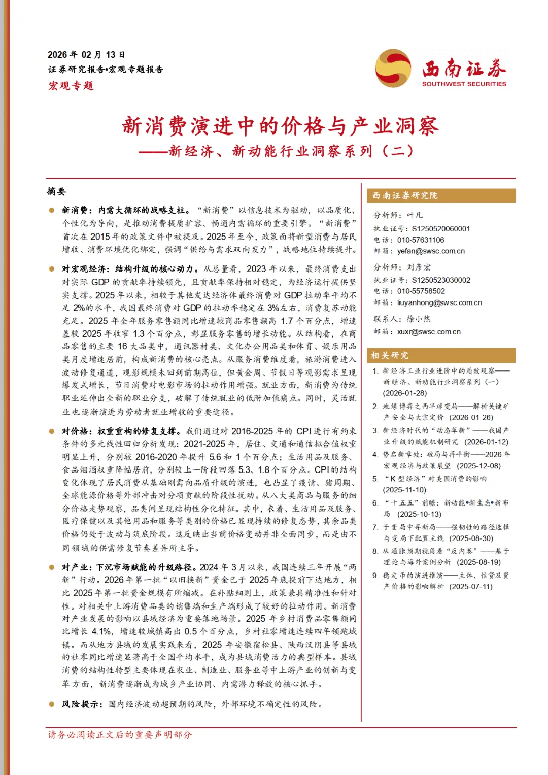 2026 年 2 月西南证券发布的这份宏观专题报告,作为新经济新动能行业洞察系列第二篇,围绕新消费展开多维度分析,指出其已成为我国内需大循环的战略支柱,2015 年首次被政策提及后,2025 年至今战略地位持续提升,在宏观经济、价格体系、产业发展等方面发挥关键作用,同时也面临内外部经济环境波动的风险。————