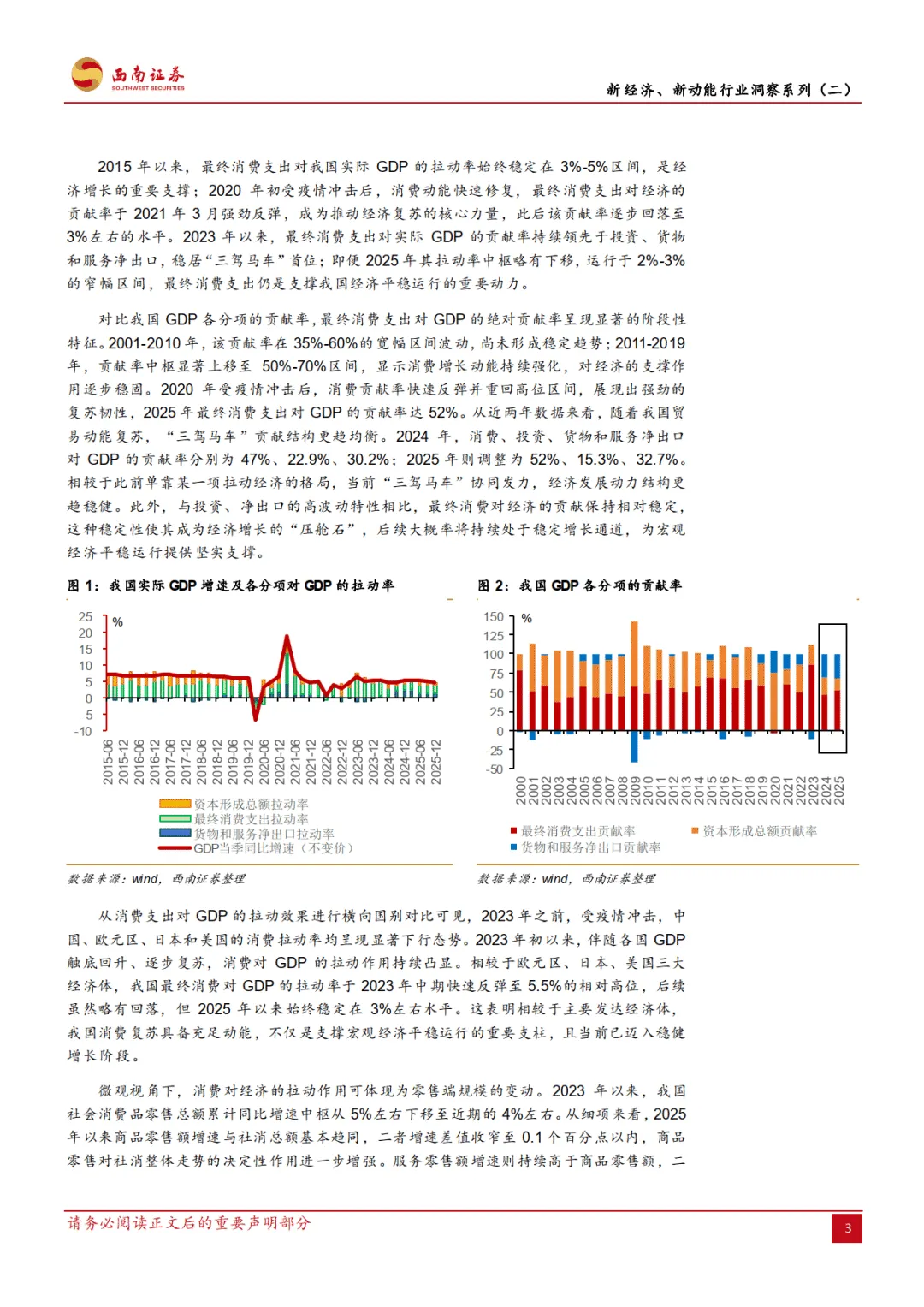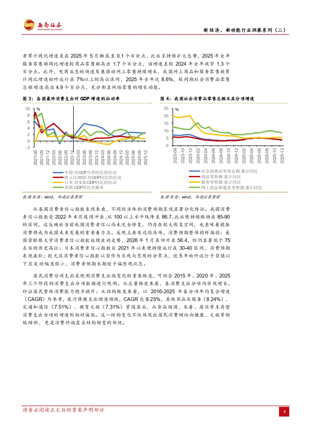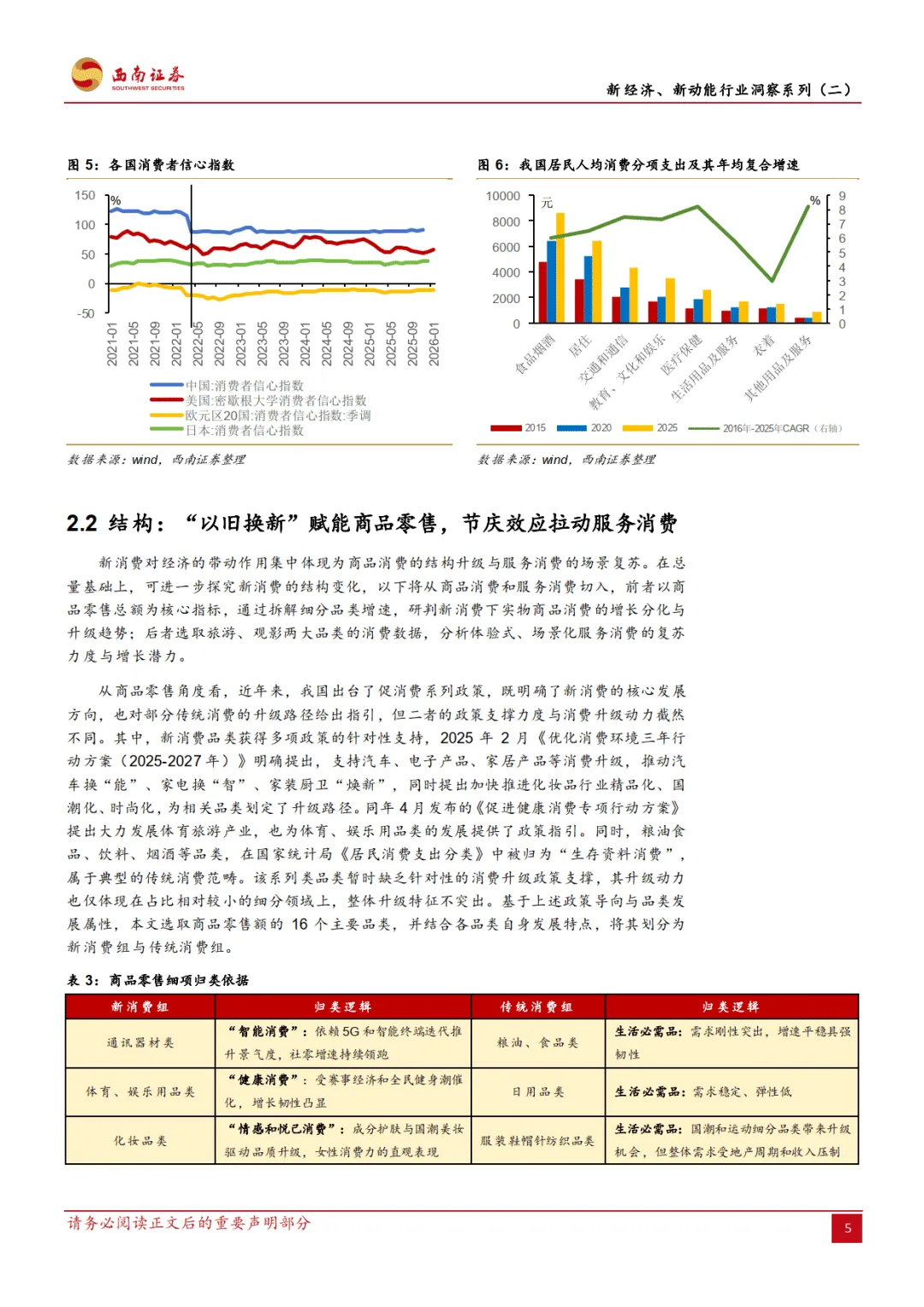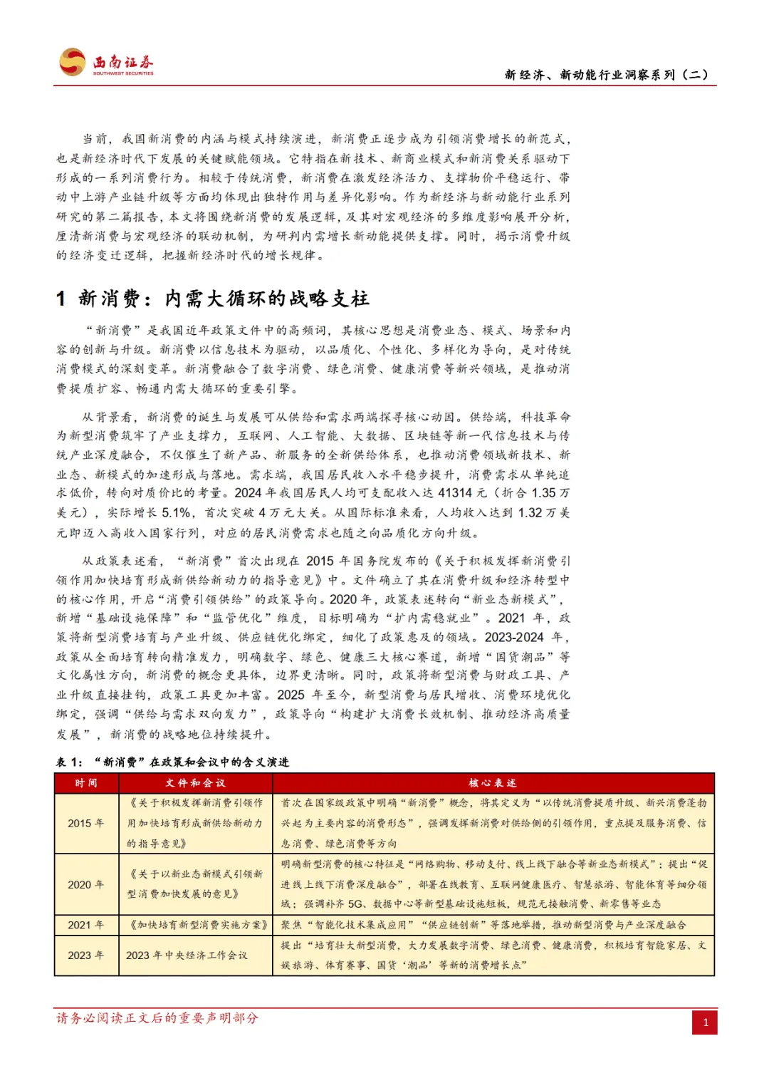 2026 年 2 月西南证券发布的这份宏观专题报告,作为新经济新动能行业洞察系列第二篇,围绕新消费展开多维度分析,指出其已成为我国内需大循环的战略支柱,2015 年首次被政策提及后,2025 年至今战略地位持续提升,在宏观经济、价格体系、产业发展等方面发挥关键作用,同时也面临内外部经济环境波动的风险。————