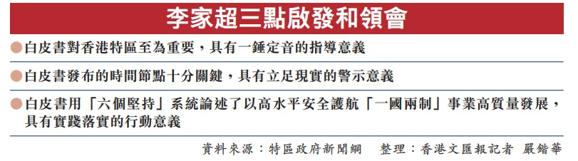 白皮書闡明了在「一國兩制」下維護國家安全的實踐要求,即堅持中央政府根本責任和特別行政區憲制責任相統一、堅持把特別行政區管治權牢牢掌握在愛國者手中、堅持尊重和保障人權、堅持在法治軌道上維護安全、堅持統籌發展和安全、堅持在開放中維護安全。這「六個堅持」既是理論遵循,也是實踐指南,為香港維護安全、促進發展提供了明確的行動指引。