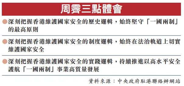 一是深刻把握香港維護國家安全的歷史邏輯,始終堅守「一國兩制」的最高原則。深信特區一定能以總體國家安全觀為指導,全面落實「愛國者治港」原則,築牢香港維護國家安全防線,保障「一國兩制」實踐行穩致遠。