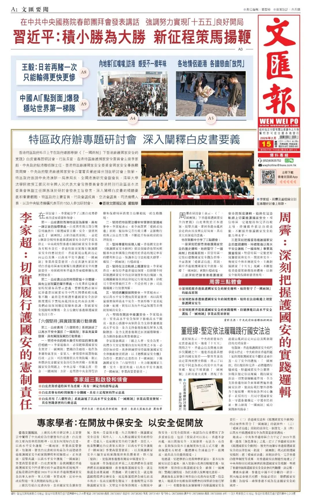 三是深刻把握香港維護國家安全的實踐邏輯,持續推進以高水平安全護航「一國兩制」事業高質量發展。堅信特區一定能更好統籌發展和安全、開放和安全、傳統安全和非傳統安全,主動對接國家「十五五」規劃,不斷塑造香港發展新動能新優勢,以新安全格局保障新發展格局。