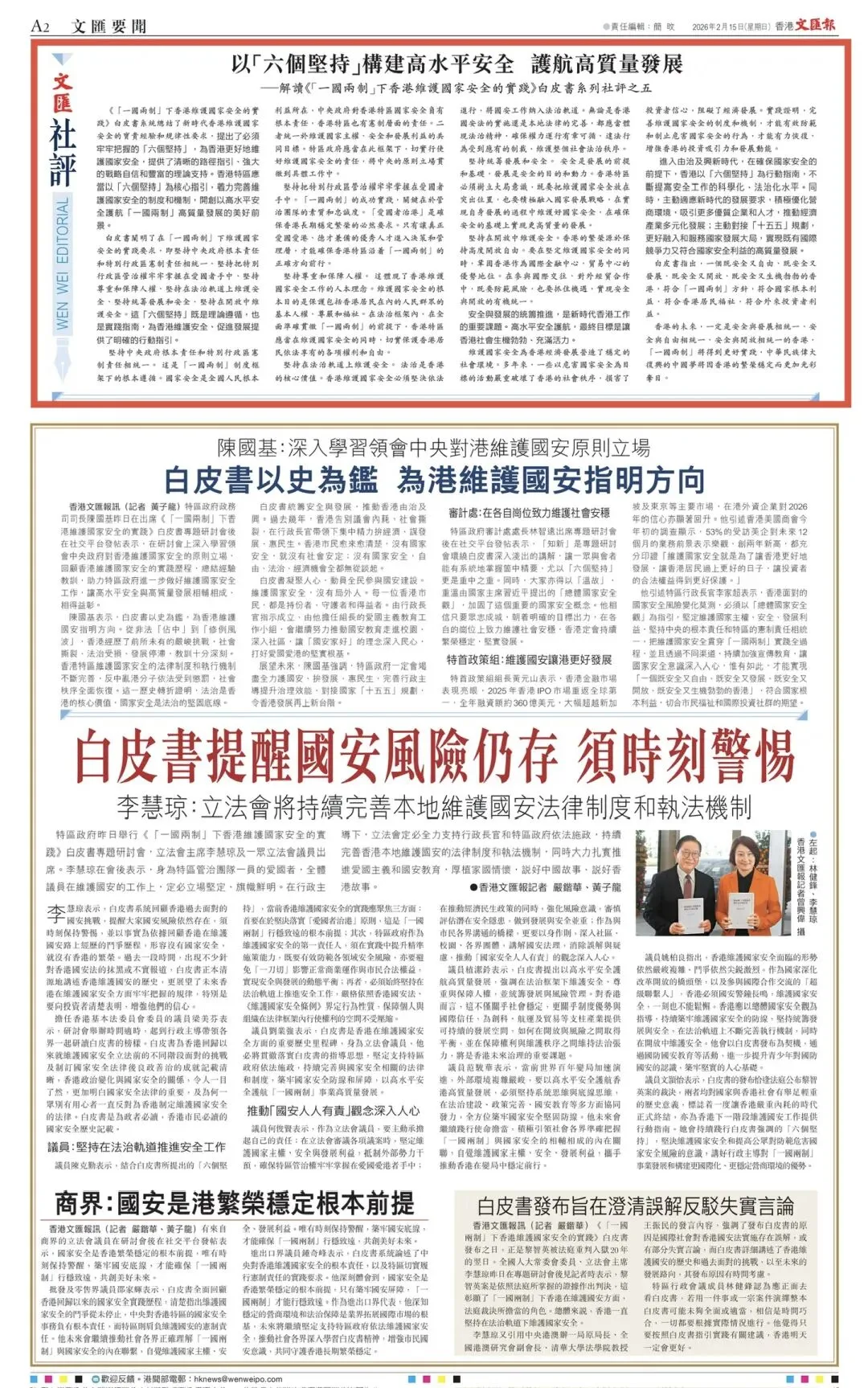 董經緯表示,中央政府發布白皮書意義重大。適逢「十五五」開局之年、香港由治及興邁出新步伐關鍵之年,適逢香港最具標誌性的國安案件——黎智英案依法定罪判刑歷史節點,展示了以習近平同志為核心的黨中央全面準確、堅定不移貫徹「一國兩制」方針的重大成果,展現了香港從由亂到治走向由治及興新階段的光明前景。