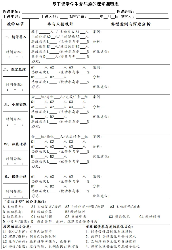 观察主题:基于学生参与度维度的课堂观察——聚焦学生在不同教学环节中的参与类型与思维层次,客观呈现学生课堂学习的真实状态。