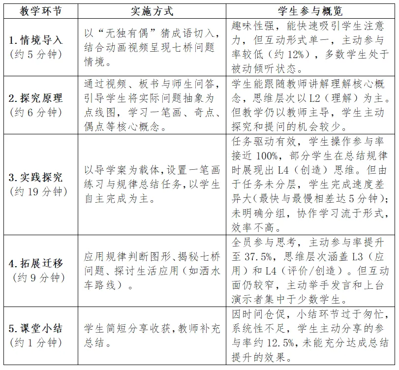 林玉琪:本节课的教学流程清晰,分为“谜语引入”“认识七桥问题”“探究一笔画规律”“解决问题”“拓展与总结”五个环节。我将重点关注每个环节中学生的参与状态变化,记录不同参与类型的人次,并选取典型学生行为进行描述,分析其背后的思维层次。