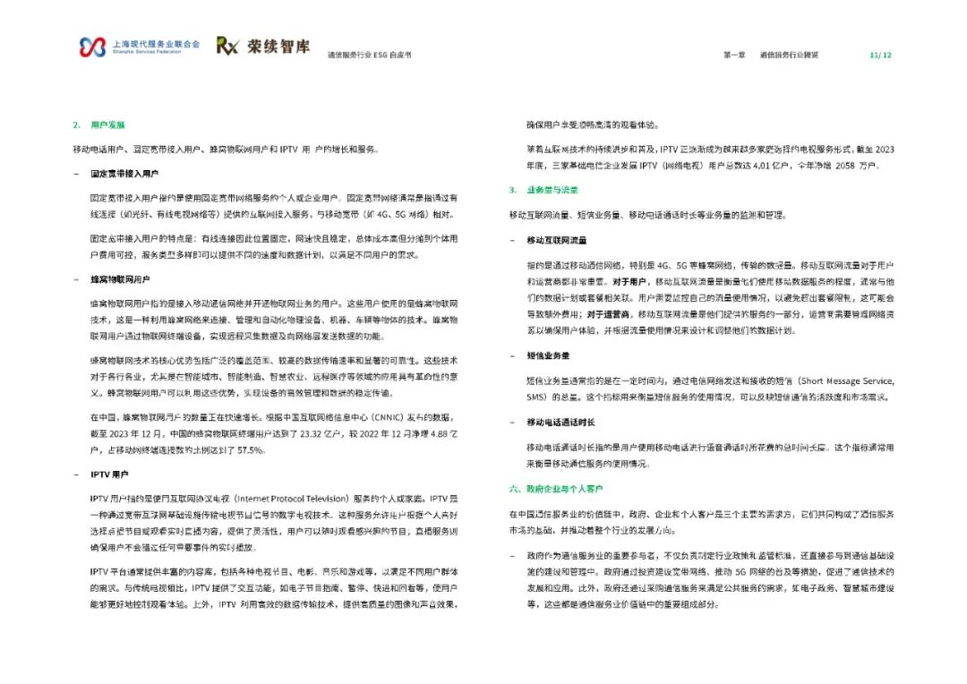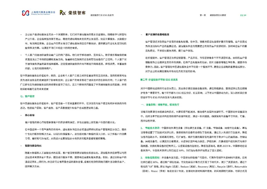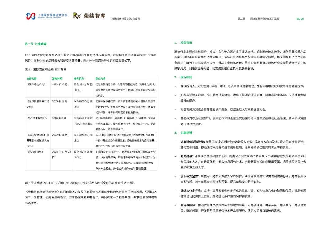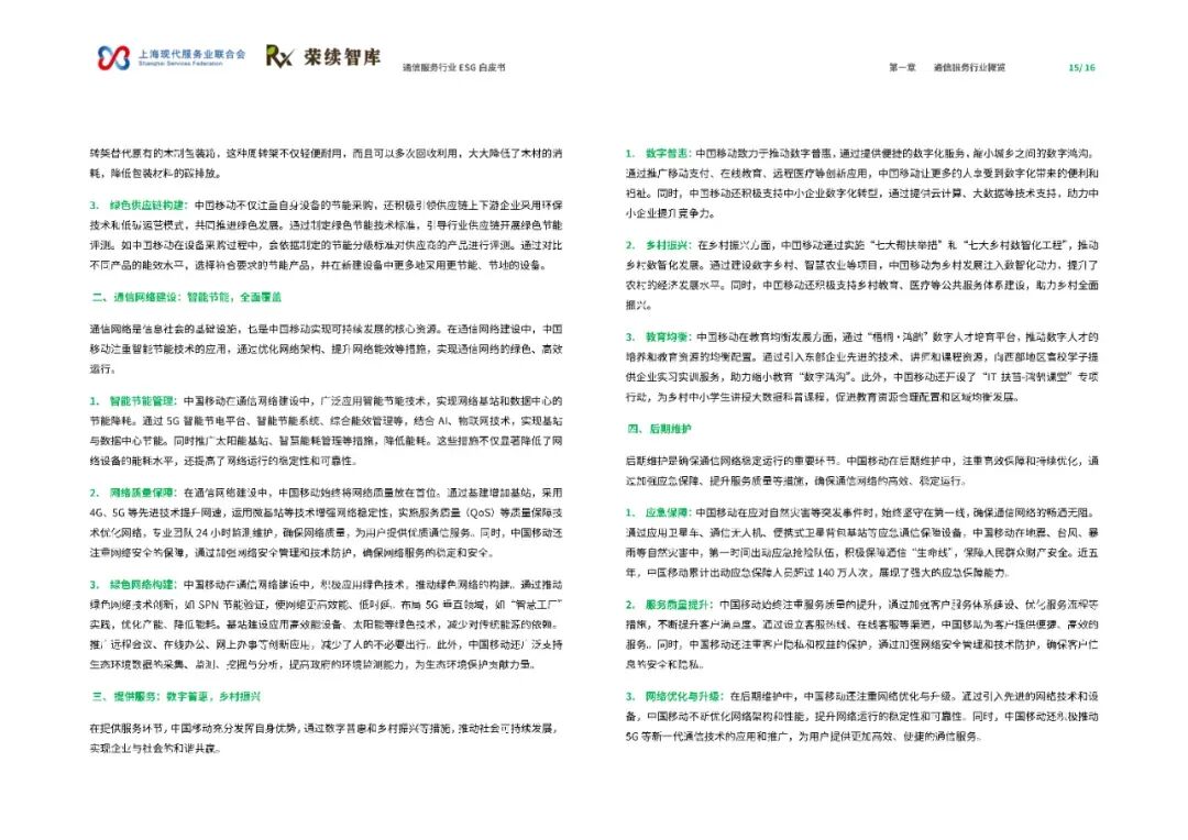 《2025通信服务行业ESG白皮书》梳理了通信服务行业的价值链,详细阐述了各环节与ESG的紧密联系。在此基础上,深入解读了国内外相关政策,剖析了环境可持续性、数据隐私与网络安全、数字普惠等核心议题。报告甄选了中国移动、中国电信、日本NTT和美国Verizon等领军企业的实践案例,从节能减排、社会责任履行到治理结构优化,多维度展示了行业在ESG框架下的创新探索与显著成效。这些案例不仅反映了企业自身的努力,也为行业提供了可借鉴的经验。报告旨在助力通信服务行业在ESG的指引下,实现更绿色、更人文、更规范的可持续发展,为行业从业者、研究者及关注者提供实用的参考与启发。