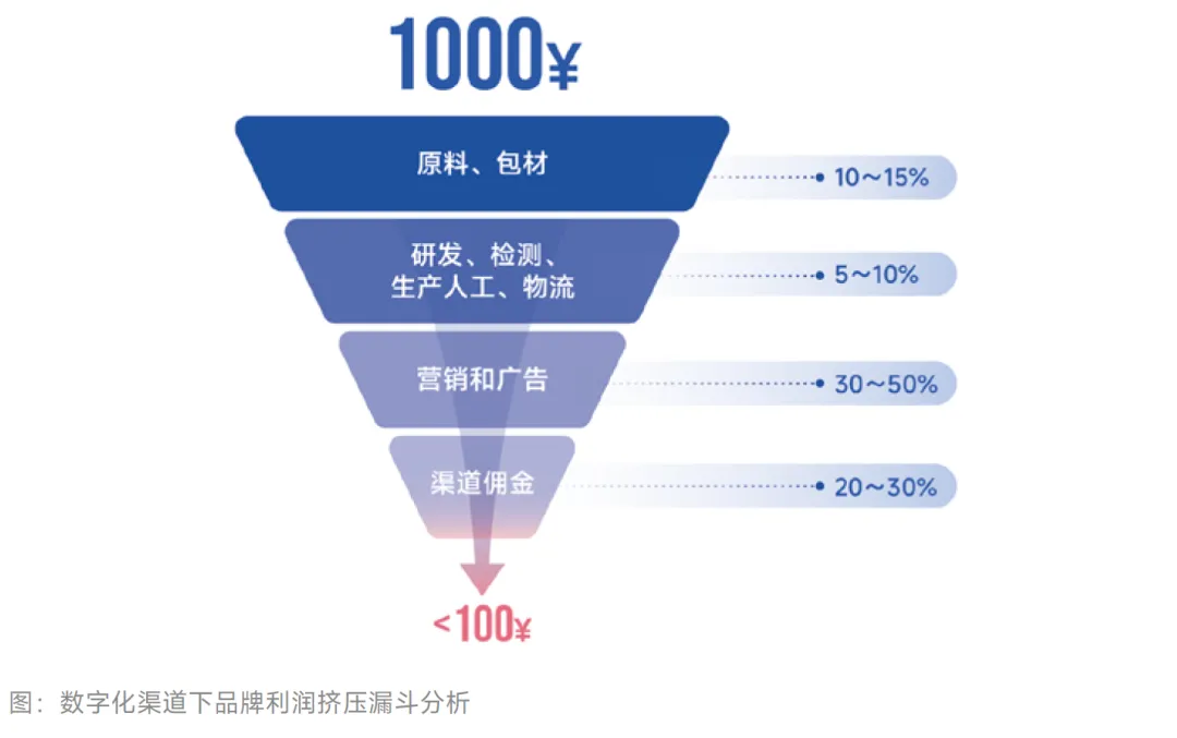 当前品牌增长面临着残酷的利润挤压问题,以一瓶市场售价 1000 元的面霜为例,其出身成本仅占售价的 10%-25%,而营销和广告费用高达售价的 30%-50%,渠道佣金占比也达到 20%-30%,最终品牌净利润不足售价的 10%,创造价值的品牌方在价值分配中处于弱势地位。