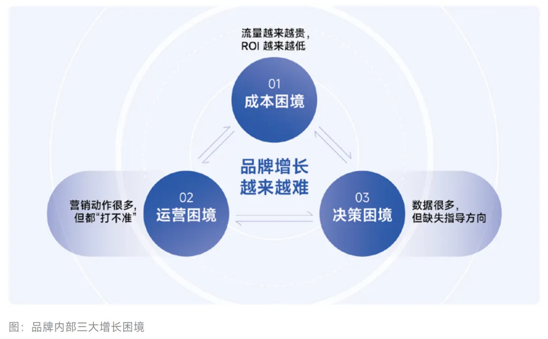 在此基础上,品牌面临着三重增长困境。一是成本高企,流量模式难以为继,“不投广告没流量,投了广告不赚钱” 成为行业共识,流量红利退潮后公域投放成本飙升,部分平台获客成本突破 500 元 / 人,淘宝近几年获客成本上涨近 12 倍,营销 ROI 断崖式下滑。二是运营失焦,传统精细化体系失效,品牌缺乏清晰的人群体系,内容和活动无法做到因人而异,同时公域、私域、线上、线下数据割裂,无法构建连贯的用户链路,导致营销动作 “打不准”,难以转化为真实生意结果。三是数据分散,增长决策陷入迷航,GMV、UV 等表面数据与真实生意增长脱钩,“刷量” 和低质流量泛滥导致品牌陷入 “自嗨式营销”,用户数据形成 “数据孤岛”,品牌无法看清用户完整决策路径,决策回归经验主义。