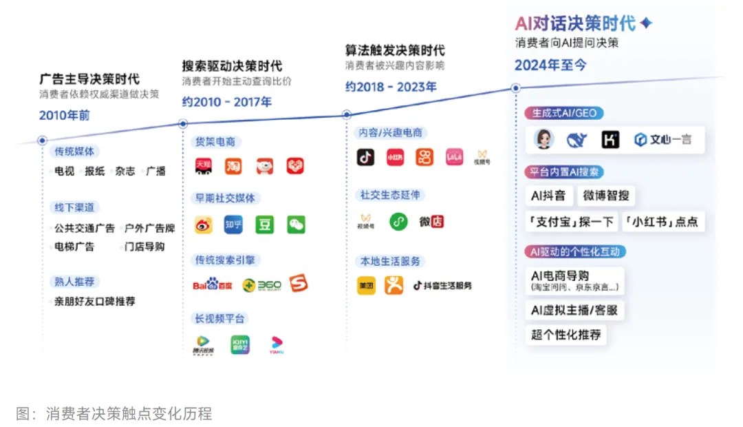 另一方面,消费心态回归 “理性”,信息入口被 AI “重塑”。在经济不确定性背景下,消费者冲动性消费退潮,快消品市场需求低迷,品牌平均 ROI 下降了 15%,消费者优先考虑性价比和真实体验,多渠道比价、推迟购买成为常态,19% 的美妆和服装品类消费者会因价格轻易更换品牌。AI 的发展进一步加剧了这一进程,AI 驱动的个性化推荐让消费者比价更便捷,加剧价格内卷;Z 世代搜索习惯从传统搜索引擎转向抖音、小红书等 “社交搜索”;生成式 AI 崛起改写品牌被用户 “找到” 的规则,截至 2025 年 6 月,我国生成式人工智能产品用户规模已达 5.15 亿人,普及率为 36.5%。Gartner 预测,到 2026 年,传统搜索引擎的流量将减少 25%,被生成式 AI 夺走,品牌 SEM/SEO 体系根基被动摇,GEO(生成式引擎优化)成为全新战场,超过 60% 的用户认为 AI 直接推荐比搜索引擎广告更值得信赖,品牌缺席 AI 驱动的新内容生态和互动场景,将失去近一半潜在生意机会。