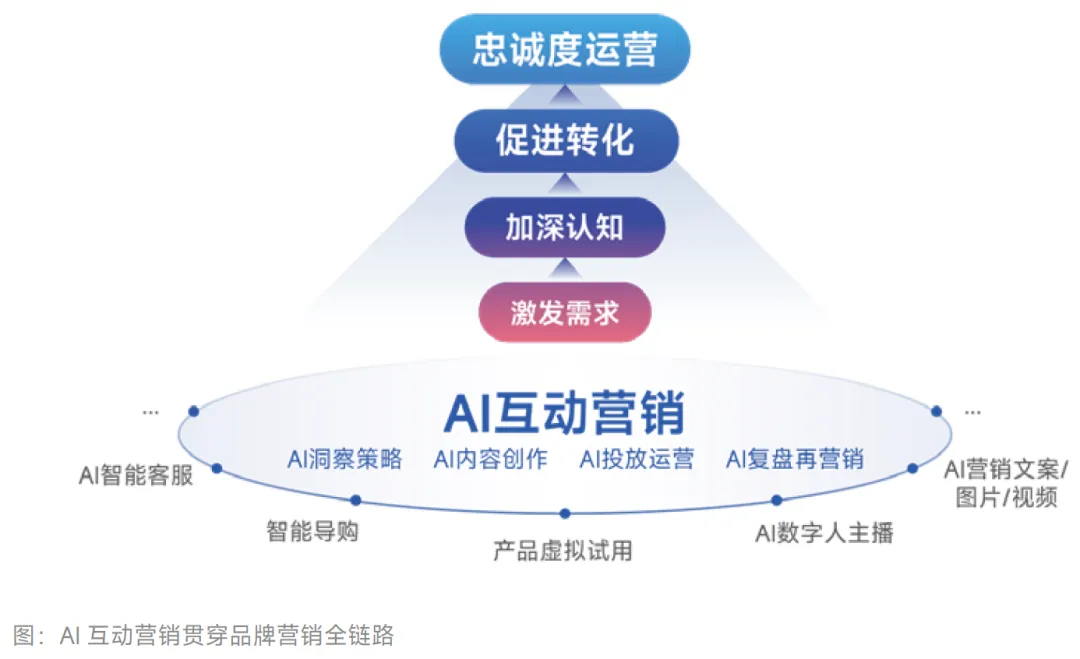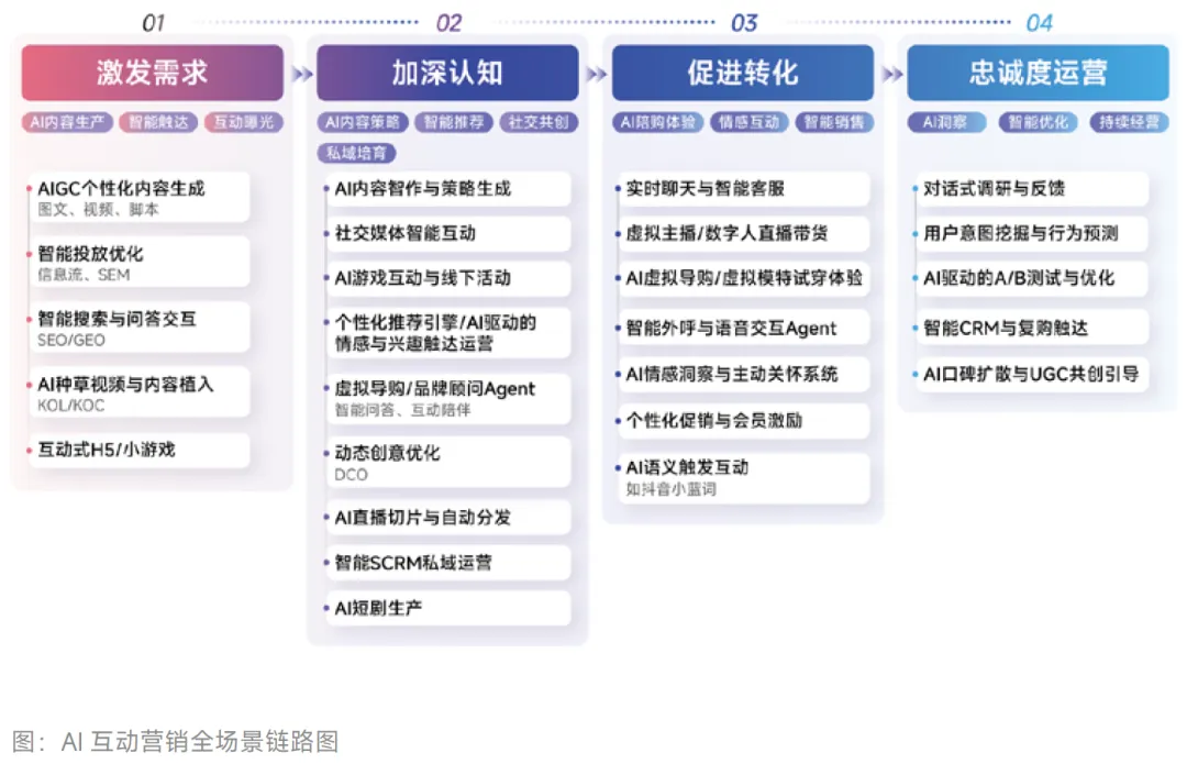 AI 互动营销能够挖掘全链路中流失的价值,一是在 “服务成本” 里挖出 “销售机会”,AI 智能客服在解决用户问题的同时,能通过语义理解用户情绪,推送专属优惠券和推荐商品,将用户抱怨转化为复购机会;二是在 “内容成本” 里挖出 “转化效率”,AIGC 可批量生成不同风格、卖点的素材,AI 投放系统根据实时数据优化推送,将营销从 “豪赌” 创意变为 “精算” 效率;三是在 “流失环节” 里挖出 “忠诚资产”,AI 通过关系互动识别高价值用户沉默迹象,触发个性化关怀激活用户,将 “用户” 转化为可运营的 “关系资产”。