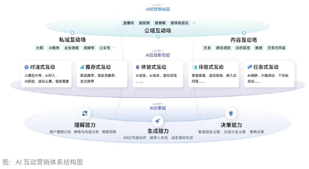 第三层是 AI 经营场域层,所有 AI 能力与互动方式需在具体业务场域落地才能转化为生意,包含三大核心 “互动场”。一是公域互动场,涵盖直播间、短视频评论区、搜索框、广告落地页等场景,核心价值是提升关注度、转化率与流量质量;二是私域互动场,涵盖 SCRM、社群、小程序、外呼等场景,核心价值是降低运营成本、提升触达效率、构建长期连接;三是内容互动场,涵盖图文、短视频、直播数字人、互动内容等场景,核心价值是强化品牌表达与建立用户记忆。三大场域底层逻辑不同,但共同构成品牌全域用户旅程,AI 互动营销打通三大场域,形成数据闭环与价值飞轮。