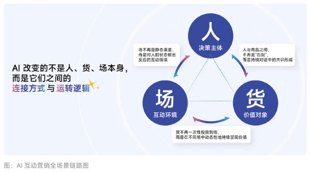 传统营销经历了三个阶段,营销 1.0 时代以电视、报纸为代表,核心诉求是 “被看见”;营销 2.0 时代由算法驱动,核心诉求是 “被偏爱”;当下的营销 3.0 时代,流量充足但关系稀缺,曝光不等于触达,点击不代表连接,传统营销是单向的、静态的、线性的 “战役式” 流程,而 AI 互动营销是双向共创的 “对话”,是 “永远在线” 的动态交互系统。