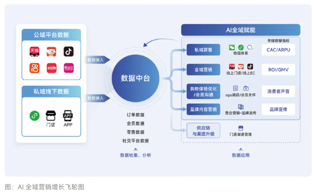 餐饮、商超、便利店等渠道驱动型品牌面临门店业绩下滑、离店成交上升、线上利润被侵蚀的挑战,“全域” 并非 “全渠道铺货”,其本质是打通用户数据,公域内容营销引流,私域精细化运营,挖掘用户全生命周期最大价值,而 AI 是实现这一闭环的 “中央神经系统”。