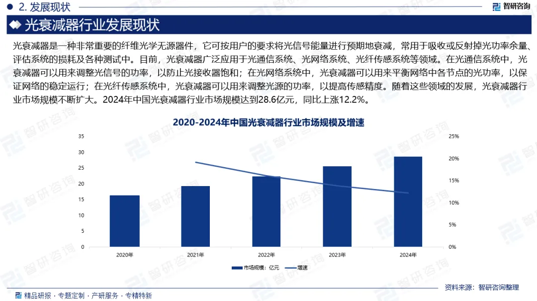 光衰减器是一种能量损耗性无源光学器件,其内部含有吸收光材料,用于减小光纤中的光信号功率。它与光放大器功能相反,但同样重要,主要用于保护光模块免受过载损害,以及在波分系统中均衡各通道光功率。光衰减器要求重量轻、体积小、精度高、稳定性好、使用方便等,广泛应用于光通信系统、光网络系统、光纤传感系统等领域。在光通信系统中,光衰减器可以用来调整光信号的功率,以防止光接收器饱和;在光网络系统中,光衰减器可以用来平衡网络中各节点的光功率,以保证网络的稳定运行;在光纤传感系统中,光衰减器可以用来调整光源的功率,以提高传感精度。随着这些领域的发展,光衰减器行业市场规模不断扩大。2024年中国光衰减器行业市场规模达到28.6亿元,同比上涨12.2%。