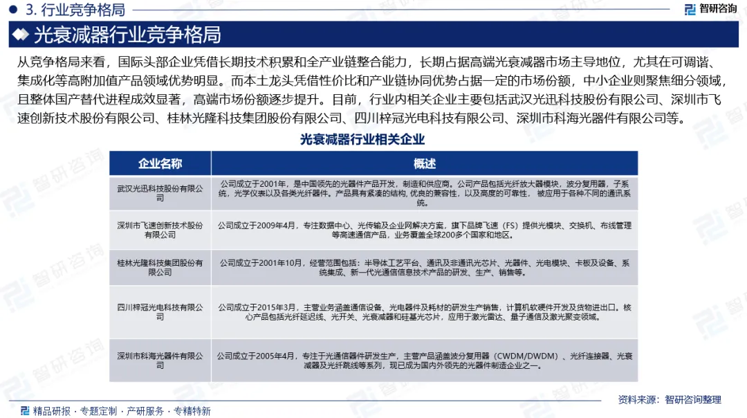 企业格局:从竞争格局来看,国际头部企业凭借长期技术积累和全产业链整合能力,长期占据高端光衰减器市场主导地位,尤其在可调谐、集成化等高附加值产品领域优势明显。而本土龙头凭借性价比和产业链协同优势占据一定的市场份额,中小企业则聚焦细分领域,且整体国产替代进程成效显著,高端市场份额逐步提升。