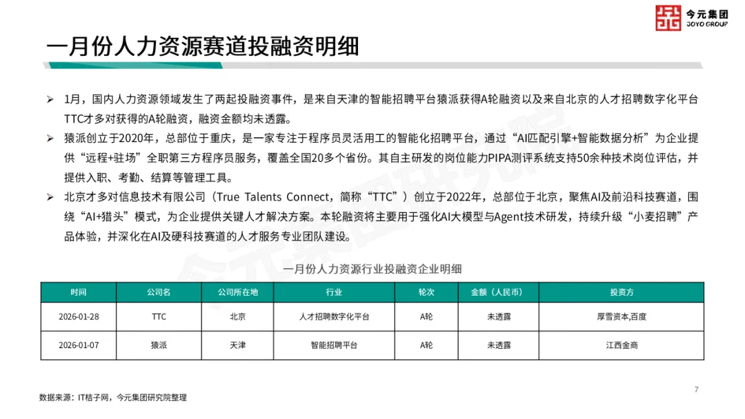 同时,报告展现了今元集团的人力资源服务能力,其以“技术+服务”为驱动,打造AI+HR系列产品,构建覆盖员工全生命周期的数字化产品与服务体系。集团业务网络覆盖150余个国家和地区,国内设400余个服务网点,提供全球EOR、薪酬管理、高端招聘、企业培训等一站式服务,服务超85000家企业,覆盖智能制造、生物医药等多个领域。此外,集团布局七大核心品牌,搭建矩阵式商业生态,依托AGI技术开发人力资源数字化助手、智能匹配系统等新工具,助力企业实现人力资源数字化闭环管理,适配各垂直行业的人才发展与转型需求。
