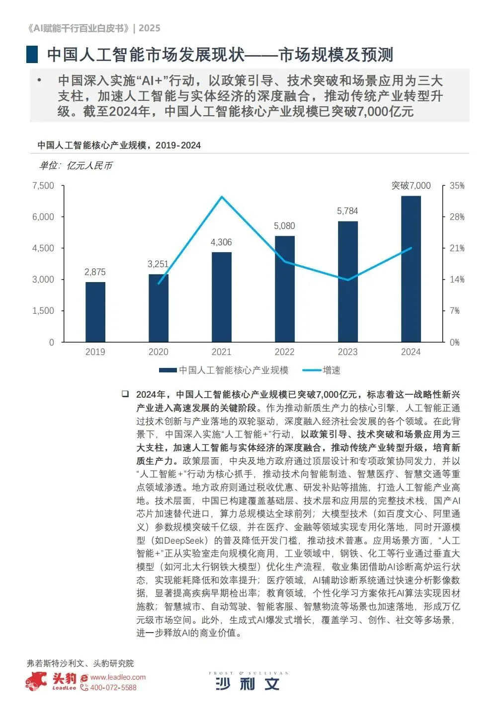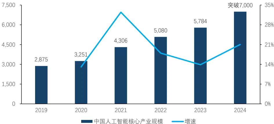 2024年核心产业规模破7,000亿元,“人工智能+”行动推动技术渗透制造、医疗、教育等领域。