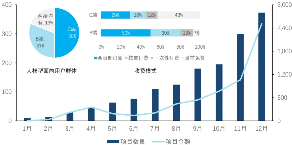 2024年大模型中标金额64.7亿元(同比增7.2倍),B端因需求明确成主战场(智能决策占比最高达2.72亿元),C端仍依赖免费模式(50%未变现)。