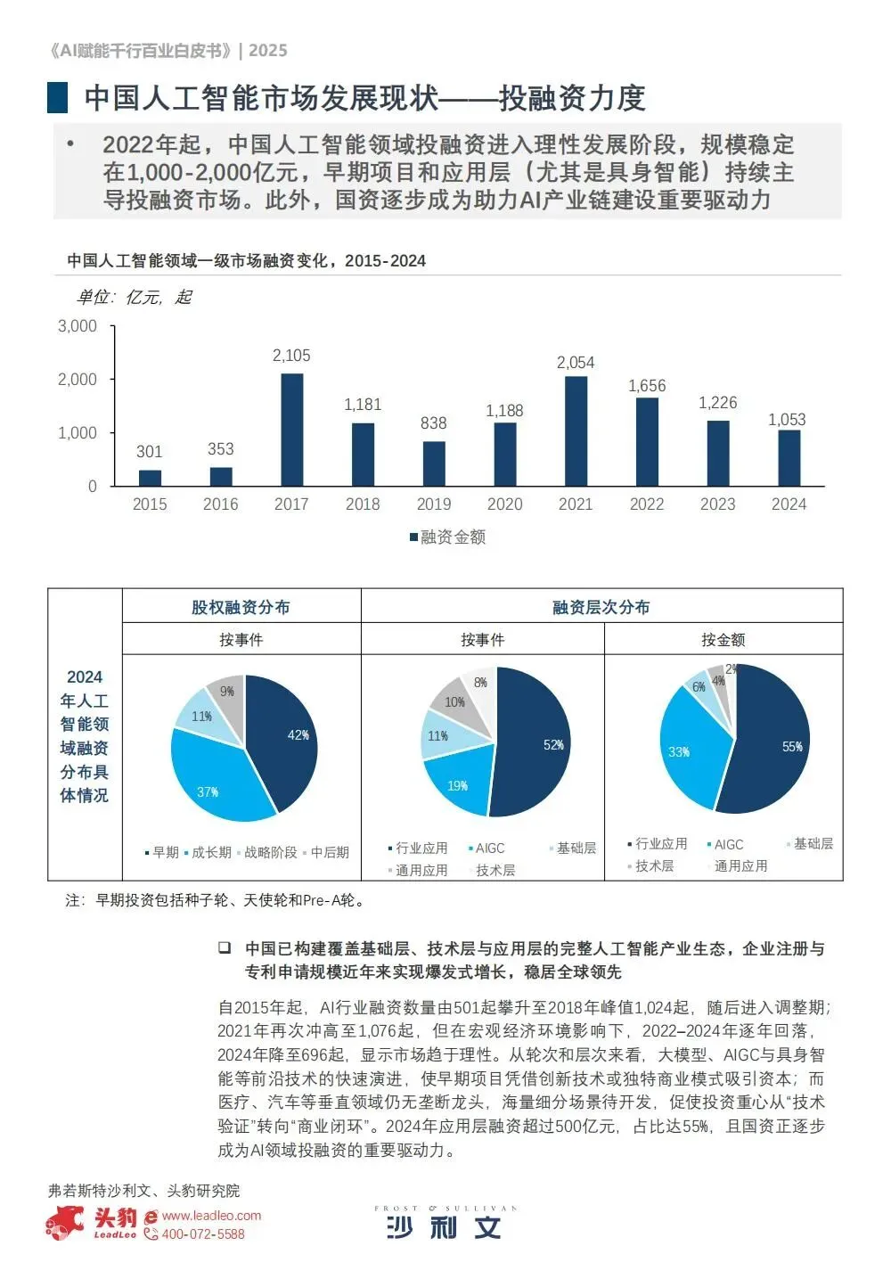 2024年融资事件降至696起,早期项目(天使轮-A轮)占比63%,应用层(如具身智能)主导市场。