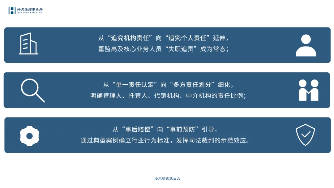 在个人责任方面,董监高、核心业务人员(如投资经理、风控负责人)因“未尽勤勉义务”被追责的案件持续增加,律师需为机构搭建“个人履职合规体系”,明确各岗位责任边界,留存履职记录,在争议发生时协助区分“故意、重大过失与一般过失”,避免个人责任不当扩大;在多方责任方面,管理人、托管人、代销机构、中介机构的责任划分成为争议核心,律师需结合案件事实与监管规则,精准论证各方过错程度与损失的因果关系,如代销机构“误导销售”的举证、托管人“实质监督义务”的履行情况等,为当事人争取有利的责任认定结果。