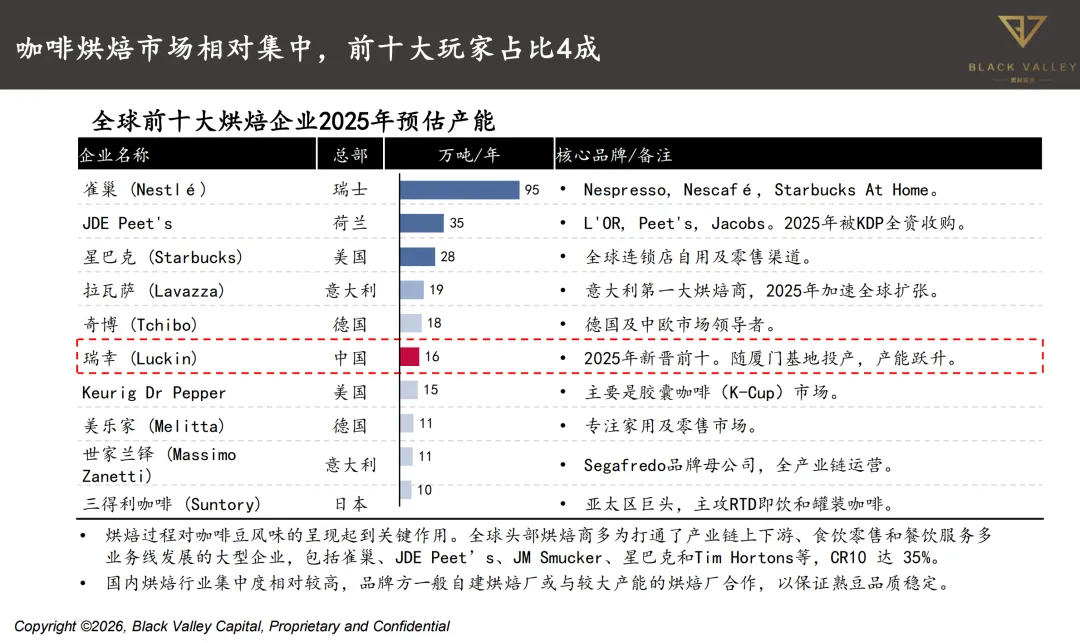 投融资的重点方向很集中,主要是三类,一是瑞幸、库迪、挪瓦咖啡这类连锁咖啡品牌,尤其是挪瓦靠着店中店的轻资产模式,也获得了数亿元融资;二是供应链升级,比如烘焙工厂建设、COFE+机器人这类自动化设备的研发应用;三是创新产品,像功能性咖啡和便捷化零售咖啡都很受资本关注。投融资的特征也很鲜明,大部分融资都集中在A轮及以前,头部品牌能持续获得资本加注,还有产业基金开始聚焦本土种植加工,比如云南就有3亿元的咖啡基金,助力本土原料产业发展。并购事件也不少,全球范围内,2025年KDP以157亿欧元收购了JDE Peet's,2024年JAB也增持了JDE Peet's的控股权。中国市场的并购也很有看点,2025年博裕资本以40亿美元拿下了星巴克中国的控股权,大钲资本也在洽谈收购Blue bottle和Costa coffee,本土资本在行业中的影响力越来越大。
