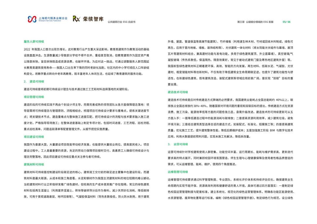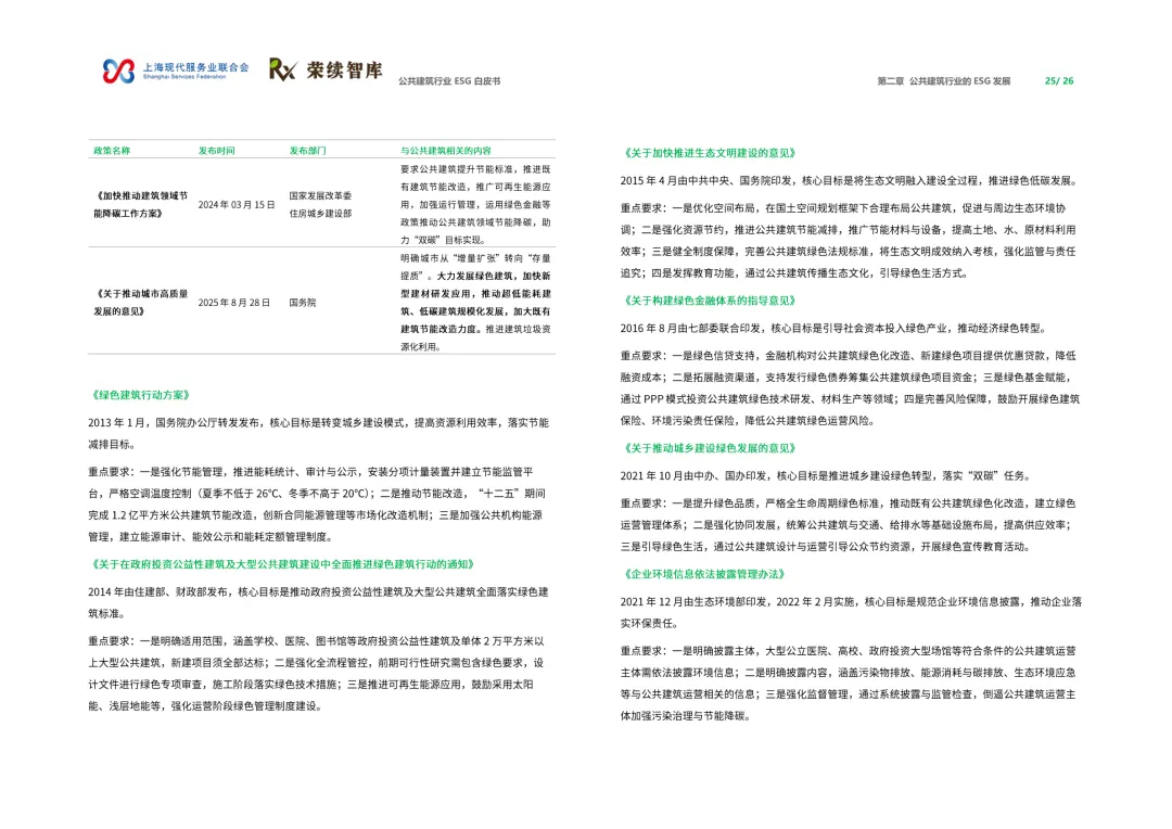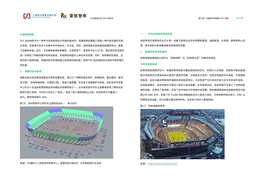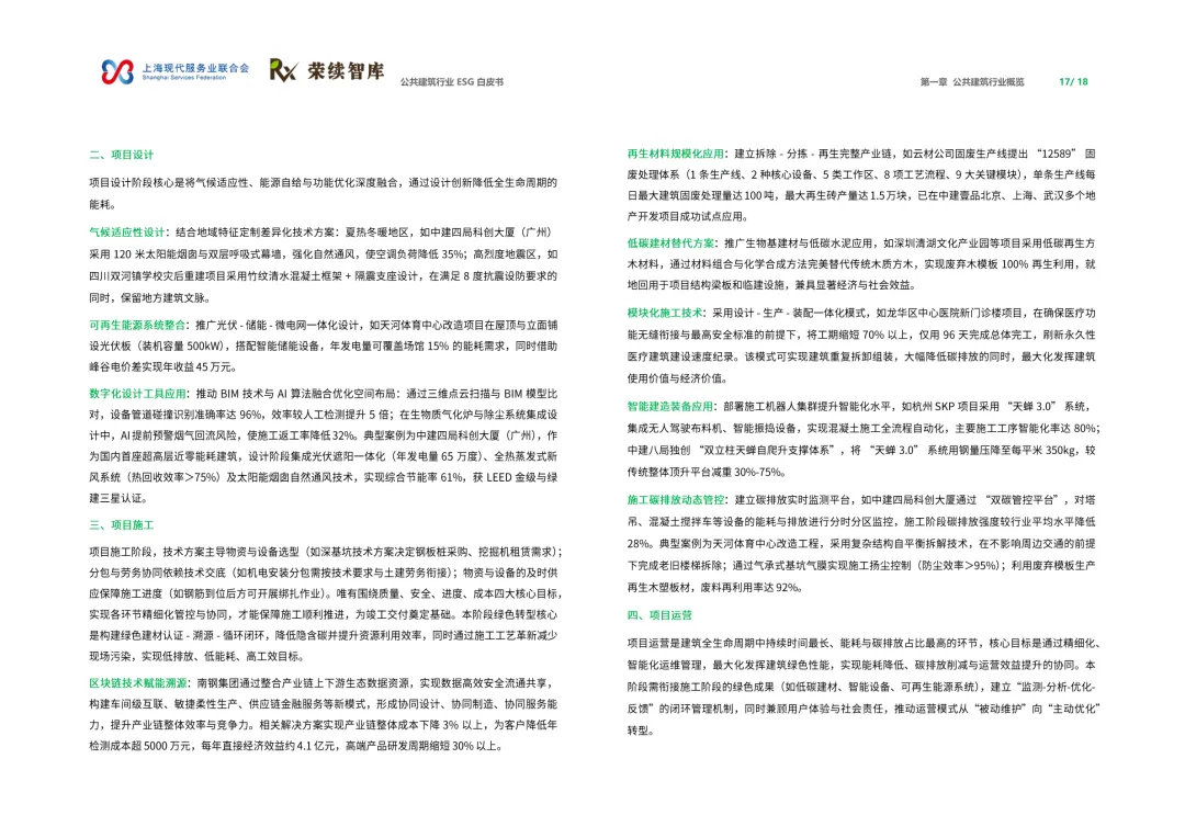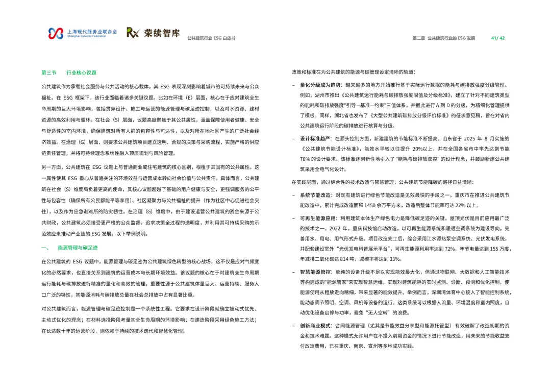 公共建筑行业 ESG 转型已成为城市可持续发展的核心支撑,政策体系从单一节能向全生命周期绿色管控演进,覆盖新建标准、存量改造、可再生能源应用等关键领域,形成国家与地方协同推进的治理框架。行业聚焦环境、社会、治理三大维度,环境端以碳减排为核心,社会端强调服务公平与包容性,治理端注重决策透明与合规。细分领域实践各具特色,教育建筑侧重全周期可持续设计与运维优化,体育场馆通过改造优先、绿色建材应用实现低碳运营,图书馆与博物馆融合文化传承与绿色技术创新。中国建筑、金隅集团等企业打造标杆项目,集成光伏一体化、智能运维、再生材料等技术,推动近零能耗建筑规模化发展。英国制造业绿色技能政策为行业提供支撑,聚焦现有岗位升级,涵盖实用、赋能及认知类技能,通过技能护照、专项培训等机制推进人才转型。两者协同发力,既推动公共建筑全链条低碳转型,又通过技能升级保障转型落地,为行业可持续发展注入双重动力。