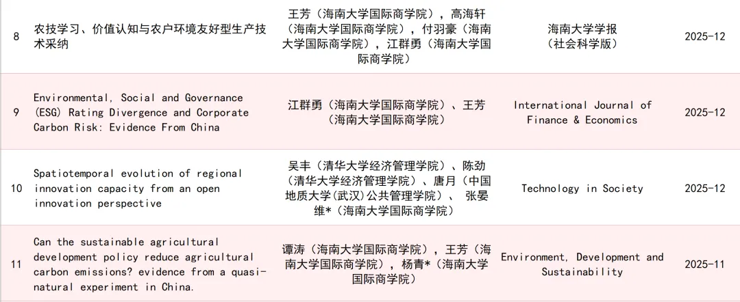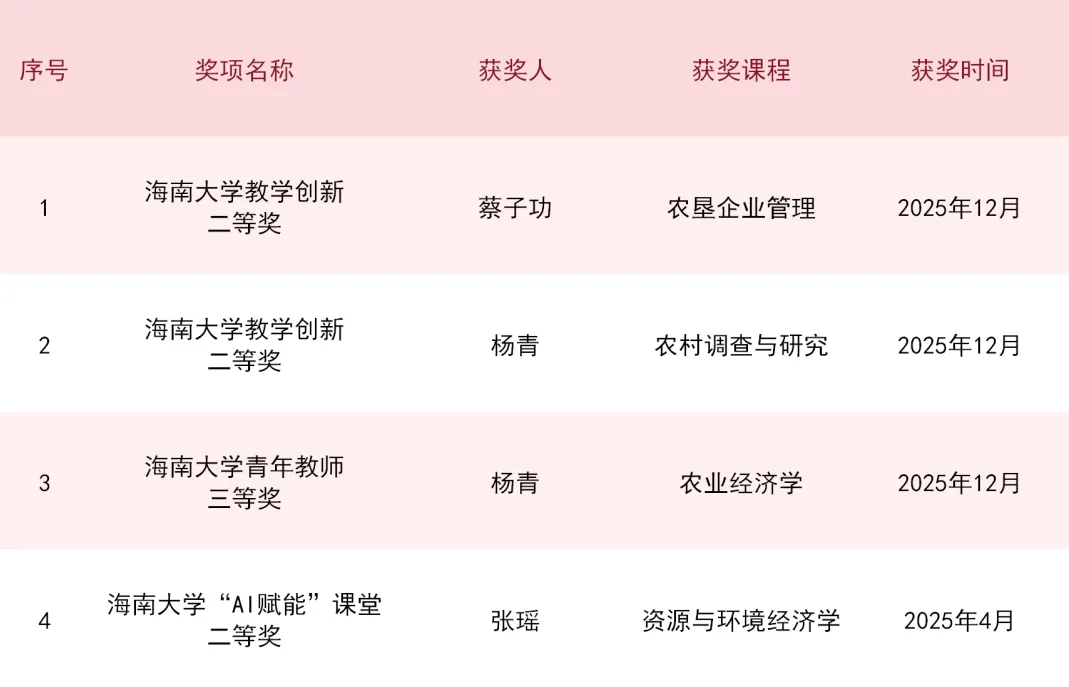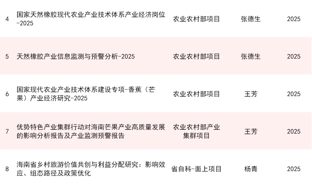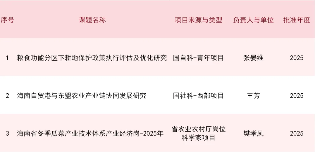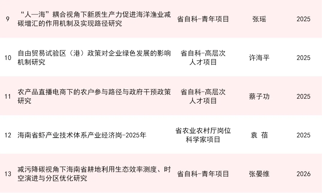 本年度共获得国家级项目2项,省部级项目10项,教改项目1项。研究议题紧密贴合粮食安全、海洋渔业、海南自贸港建设等国家前沿战略需求。