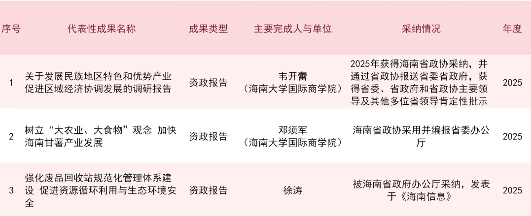 学科社会服务成效显著,依托国家和省现代农业产业技术体系产业经济岗位,积极服务农业农村部科技司、农垦局和种植业司及海南省有关部门,提交20余份研究报告与政策建议,多份报告获采纳或领导批示。