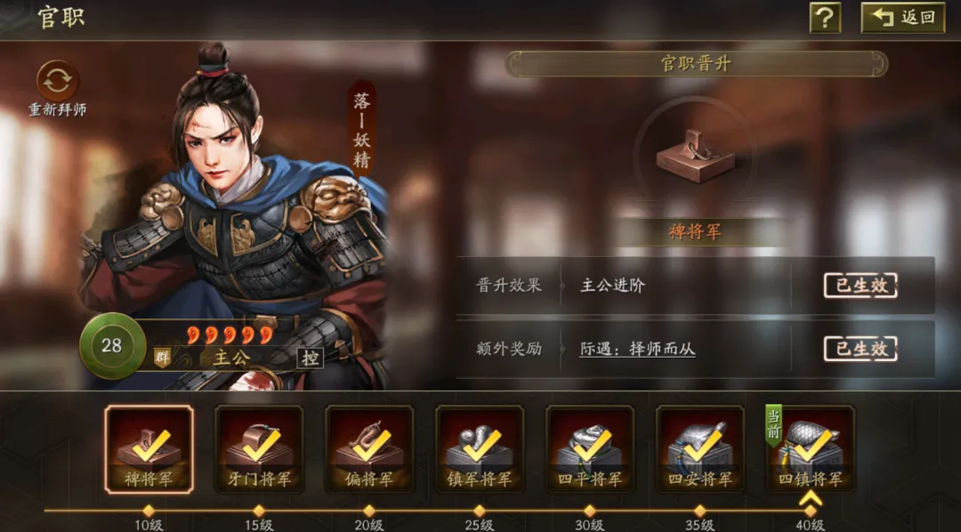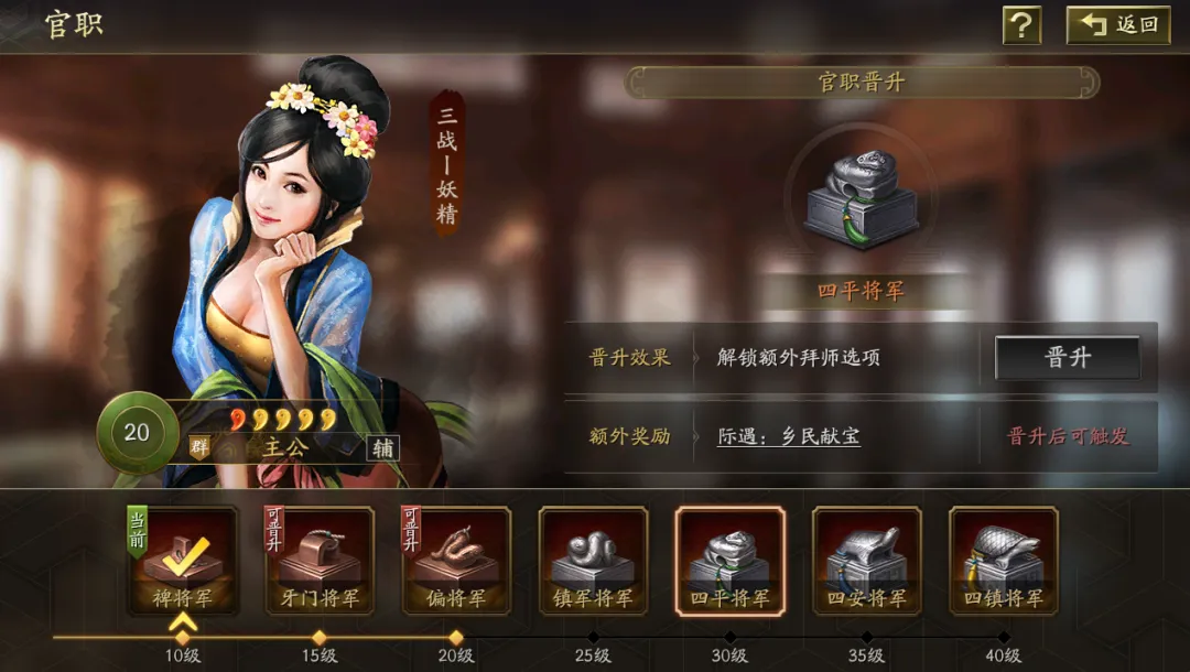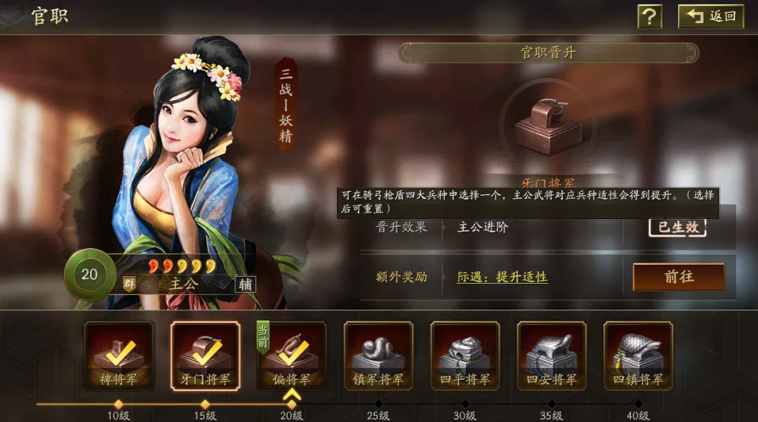继续提升到特定等级后,可以在官职界面进行官职晋升,每次晋升均会自动获得晋升奖励,晋升奖励包括主公武将进阶,主公武将觉醒,每次晋升后还可获得额外奖励-际遇。