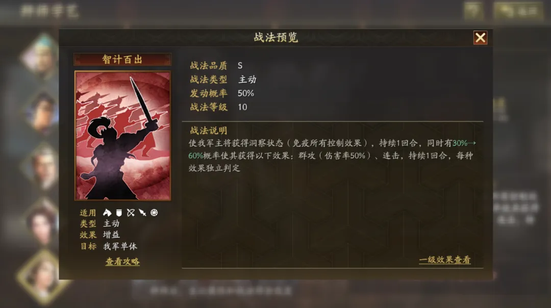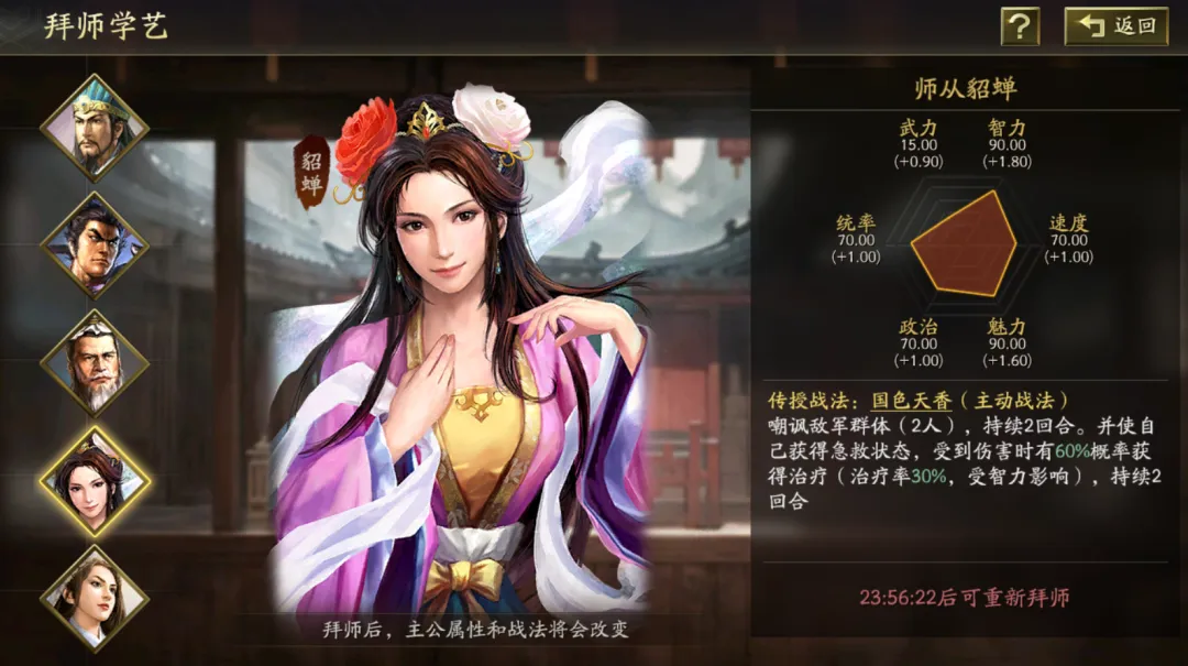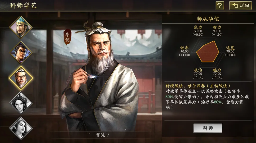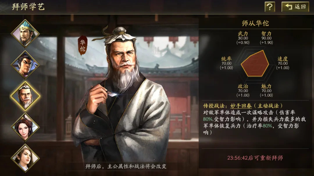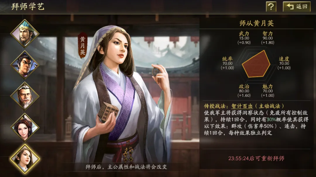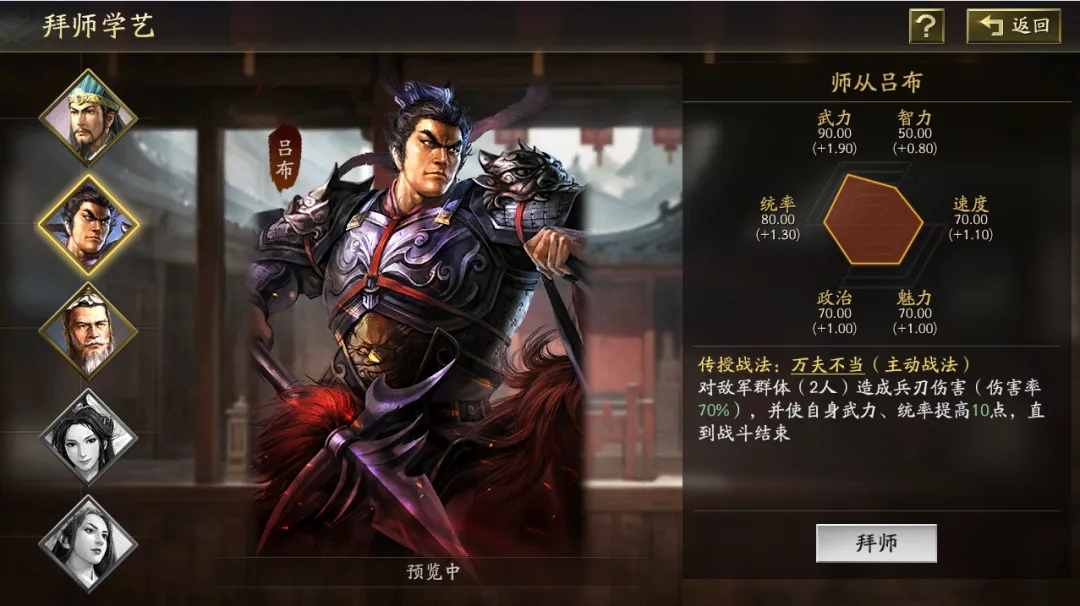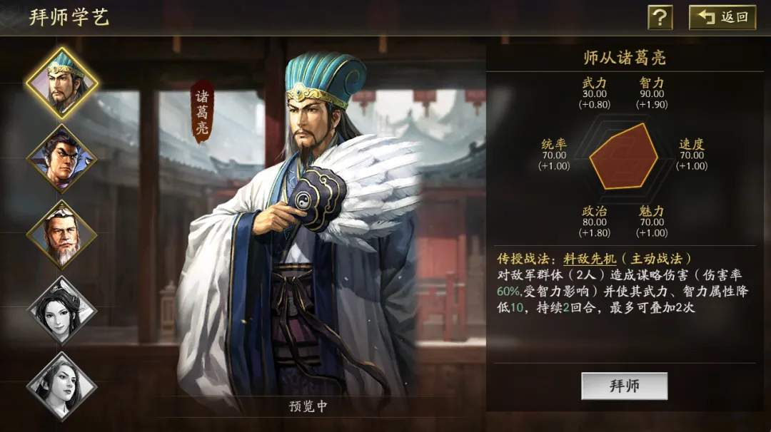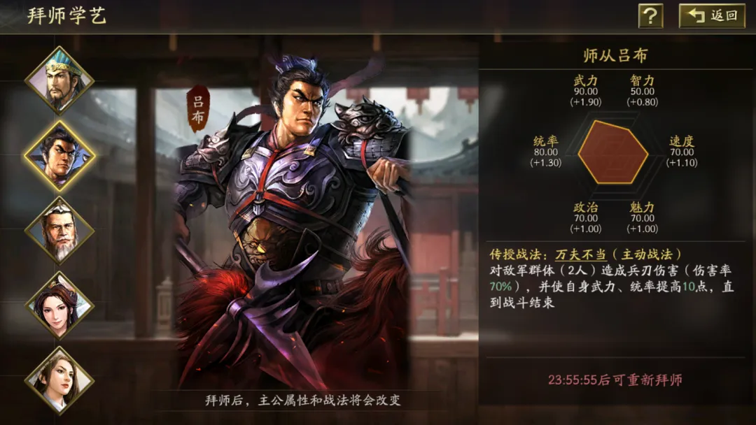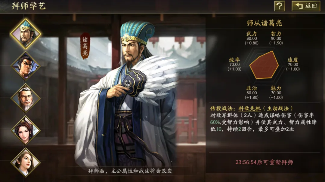 主公武将10级后可通过拜师改变自身自带战法和属性