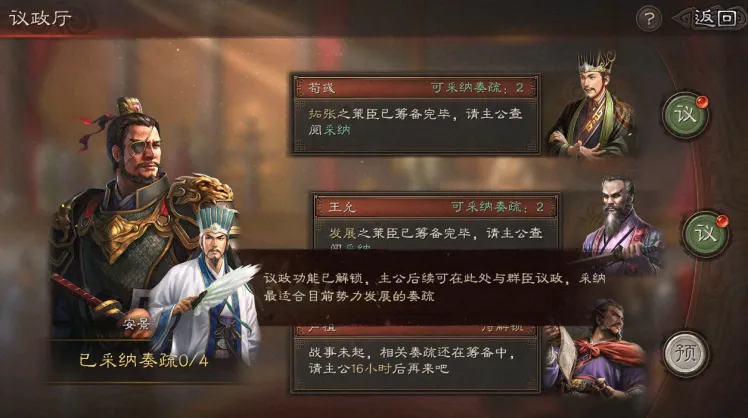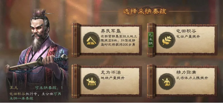 开荒期5天后建议选择无为而治+屯田积谷,如果说缺高级地可以把无为而治改为募民军垦;