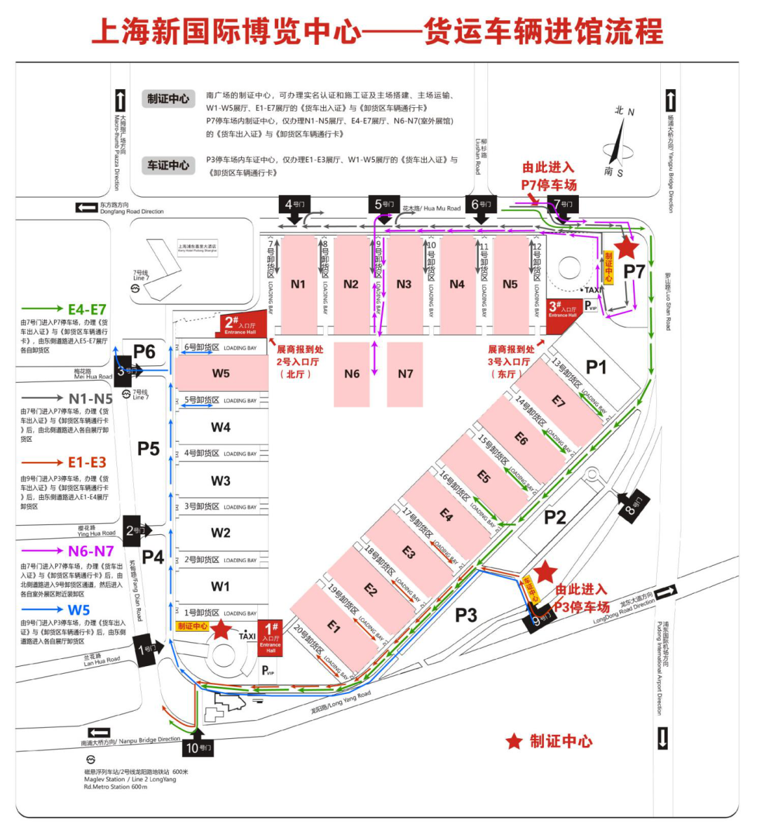 N1-N5、E4-E7、ON6-ON7馆货运车辆请进入P7停车场+制证中心 (东大厅)