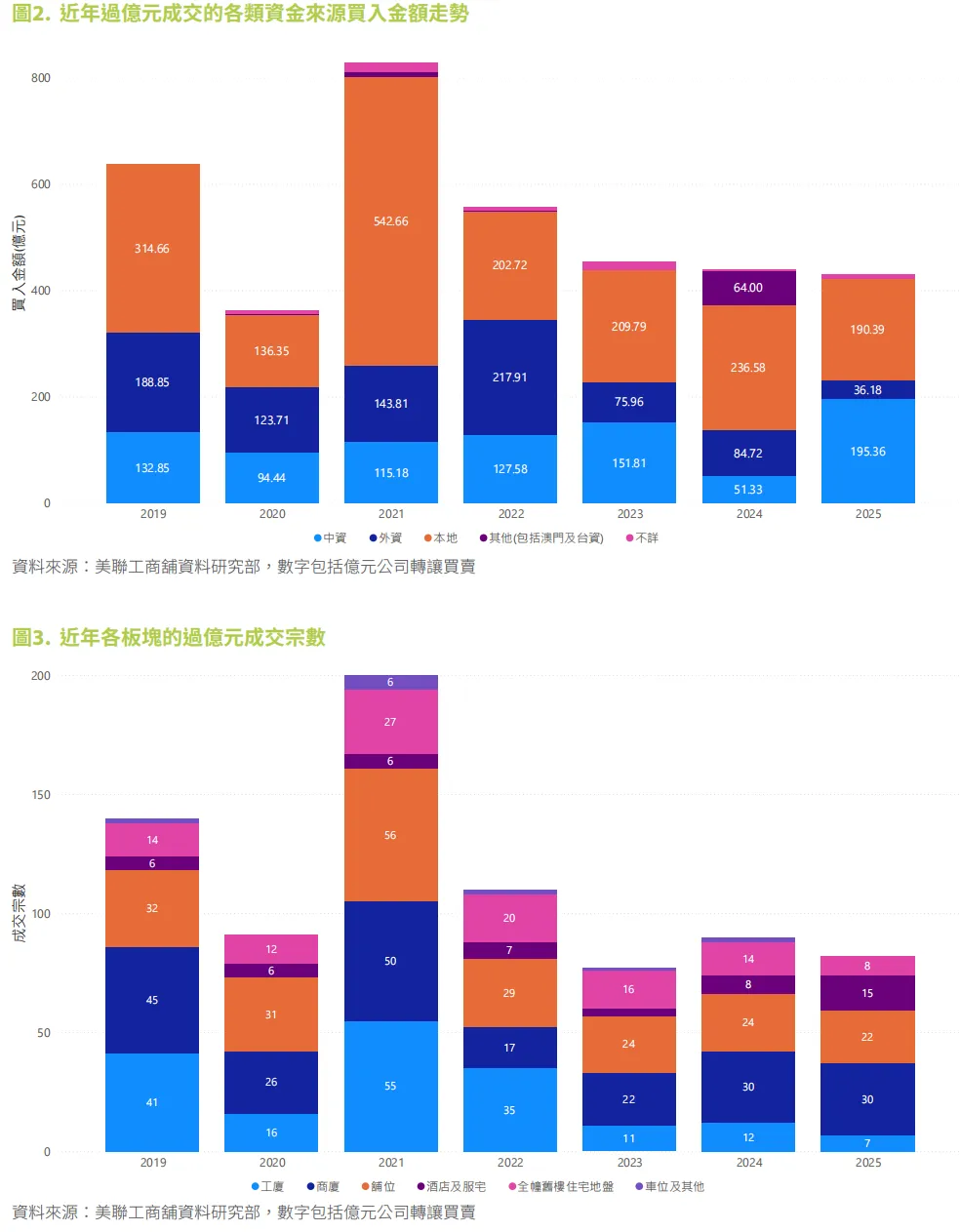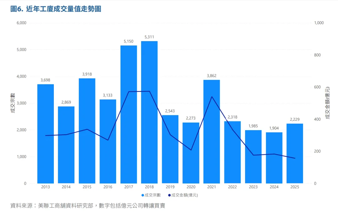 2025年工厦成交宗数约为2,229宗,同比上升17.1%,但成交金额仅约156亿元,同比反而下跌14.6%,反映交投回暖主要来自中细价物业买卖,而非大额物业投资。