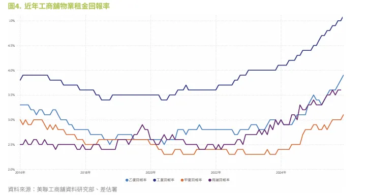 去年工商铺售价持续承压,但租金跌幅温和(全年仅约5%以内),令工商铺租金回报率推升至3.1%-5.1%。此现象源于企业优先选择租赁物业以优化资本结构,提升业务灵活性,支撑租赁市场稳定。