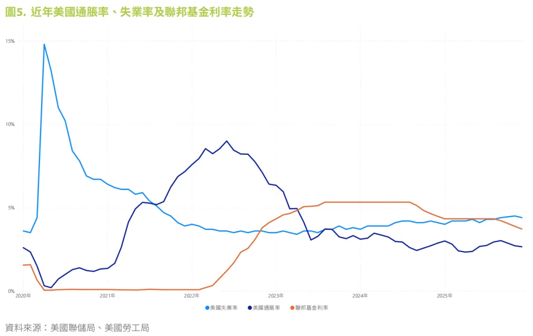 去年美国就部分贸易政策措施作出调整,市场普遍认为相关因素在一定程度上影响联储局的减息步伐,其后联储局自9月起合共减息3次。整体而言,美国通胀仍维持于约2.5%至3%区间,就业市场亦出现放缓迹象,失业率约在4.5%水平。根据联储局点阵图所反映的利率路径预期,市场一般预期未来仍存在进一步减息空间。较宽松的货币环境或有利投资市场气氛,但投资者仍需留意相关政策及司法程序可能带来的不确定性,以及联储局未来人事安排变动对货币政策取向的潜在影响。