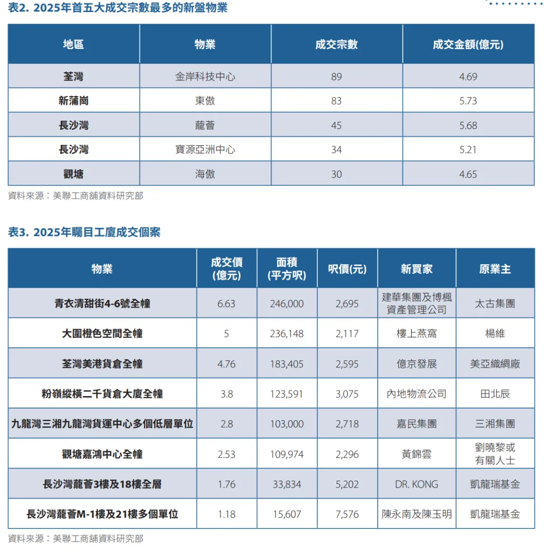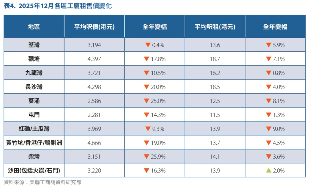 区域表现分化,例如观塘、葵涌、长沙湾等传统工业区的工厦售价全年跌幅普遍超过一成半甚至近两成,但个别区域如荃湾区的工厦售价及九龙湾区的工厦租金仅微跌1%以内;沙田区的工厦租金更录得轻微升幅,反映具物流、科研或内部需求支持的区份相对抗跌。