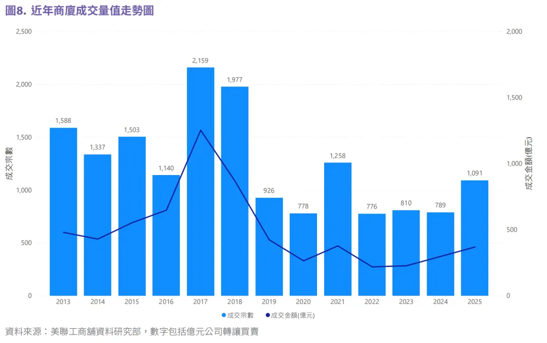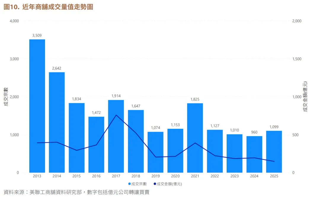2025年商铺成交约为1,099宗,按年升约14.5%,但成交金额仅为148亿元,按年反跌近24.3%,显示「量升额跌」。成交金额下跌反映去年商铺的新增成交多属中细价物业或折让盘,令平均每宗成交的银码明显收缩。