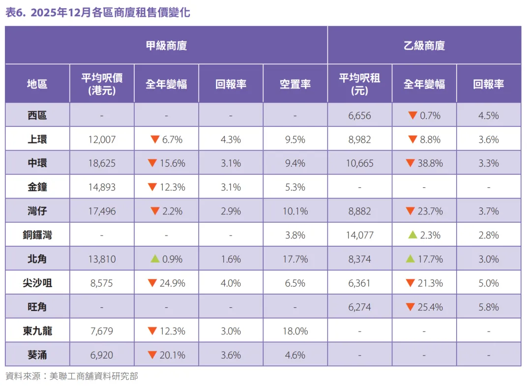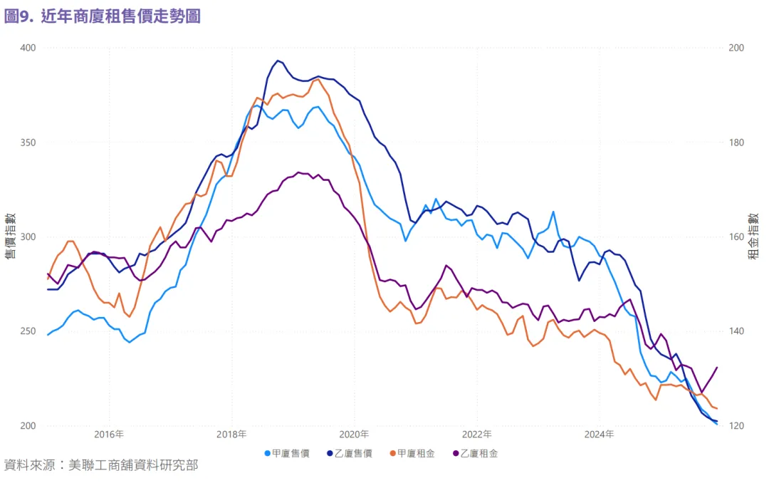 由于商厦价格跌幅同样多于租金,甲、乙厦租金回报率已回升至约3厘及3.8厘,对长线机构及家族资金具一定吸引力。同时,核心商业区的甲厦空置率已开始从高位回落。