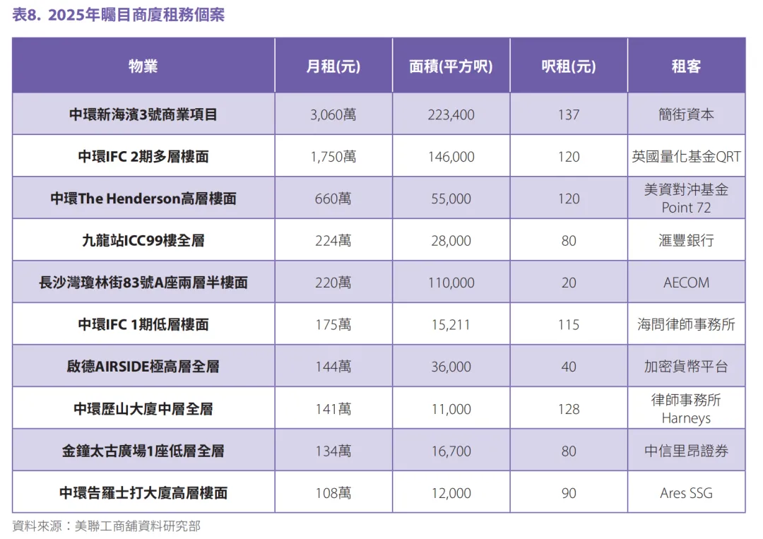 需求层面而言,2025年IPO集资额上升、股市气氛好转,加上仍有逾300宗IPO申请排队,预期2026年金融相关机构(投行、券商、资管、保险、专业服务)将持续扩租,金融业主导核心写字楼租赁,令商厦租金见底。