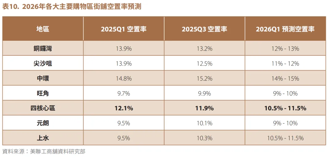 投资角度上,核心区铺位的「租务稳定性」成为焦点:随着装修及新开店舖增加,四大核心区街铺空置率有望逐步回落,如能持续,吉铺风险下降,配合商铺租金回报率达3.6–5厘的水平,料有利吸引长线资金重新部署核心地段街铺及基座商场。