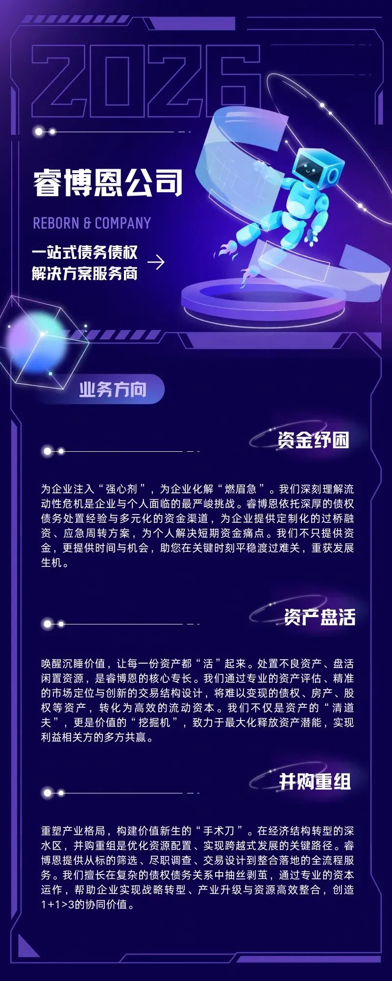 继麦肯锡,波士顿,淡马锡,贝莱德等顶级咨询和投资公司,名不见经传的“睿博恩”横空出世。源自英文“Reborn”,涅槃重生之意,是国内首批专注于一站式债务债权解决方案的服务商,每年为千余家企业包括银行、金融机构、政府平台、中小企业提供安全高效的风险化解咨询服务。在当下房地产和金融领域的特殊挑战时期,睿博恩的纾困工作取得了积极有效的成绩,在业界赢得良好的口碑,公司在青岛为中小企业客户开设了“重生茶室”,诚邀各界有识之士共襄盛举。