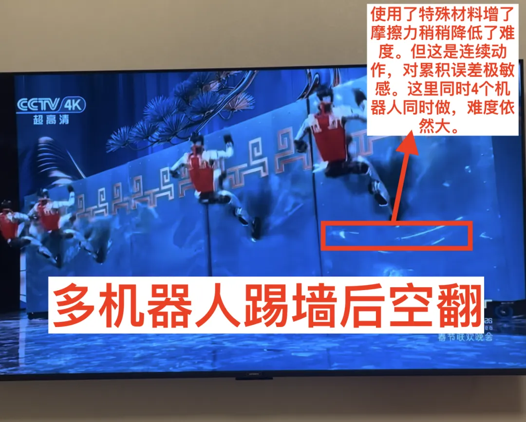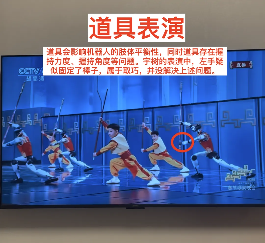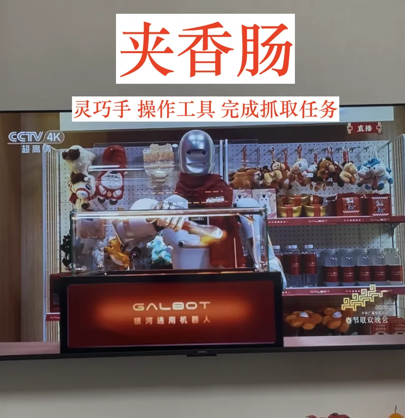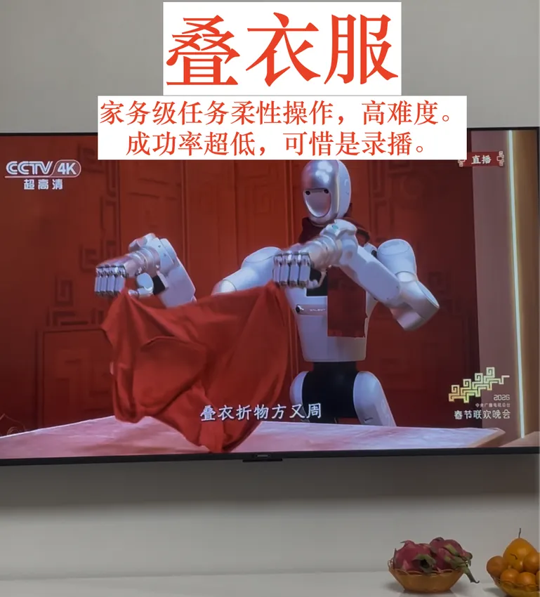 今晚一共出现了四家机器人公司的名字,其中三家做本体,一家做模型。本文先分析实体公司:宇树、松延动力、魔法原子,最后分析模型公司:银河通用。 本次节目的所有机器人都没有涉及到人工智能的认知层,顶多是感知、认知层面。对春晚中出现的动作,从难度上,可以划分为4个层次:真人互动 > 道具表演(如:舞棍子)> 无道具连续动作(如:连续后空翻) > 单个动作(如:跑步)。 连续动作为什么难?因为存在累积误差问题,前一个动作即便不失误,但是动作一旦不标准可能导致后面的动作更加不标准,甚至累积出能导致动作失败的误差。宇树机器人动作流畅,有韵律感。多个动作都能看出这点,例如冲刺翻越障碍物,对手腿协调、反应时机是个挑战,机器人必须在跑动到障碍物的瞬间完成手撑和抬腿跳,仅这个动作就能完爆松延动力。这点上最明显体现就是连续后空翻和踢墙后空翻,我注意到“连续后空翻”时机器人一共翻转了720度,第二跟头必须克服第一个跟头带来的惯性,如果第二个跟头有错误,那么就会影响到第三个跟头。“踢墙后空翻”时,机器人要借助冲刺的惯性登足够高再后空翻,同样要求前面的动作必须精准。 道具表演为什么难?道具会影响机器人的肢体平衡性,同时道具存在握持力度、握持角度等问题。宇树的表演中,左手疑似固定了棒子,属于取巧,并没解决上述问题。 目前宇树达到了什么样的水平呢?在真人互动、道具表演上,大概率是硬编码,即这两部分相比于去年的时候没有实际进步。宇树最厉害的还是2点,一是运动控制非常流畅,二是产品价格低,宇树具有供应链优势。为了和上游机器人零件谈价格,必须有足够的出货量。这次借助春晚的成功表演,宇树的优势很可能被巩固。 松延、魔法原子目前情况如何?松延和宇树至少有1年的技术代差,目前仅能完成单个动作,且松延最大的问题在于产品定位尴尬,松延机器人能做的宇树能做得更好,缺乏差异化。并且松延在品牌宣传上经验不足,马年春晚小品“奶奶的最爱”基本全是硬告,毫无笑点(宇树在营销上强得多,封面中机器人倒地的场景是故意的节目效果,直播的时候真的把我吓到了),虽然曝光度很高,但是这个流量大概率会因为与宇树的产品代差原因无法被转化,前景堪忧。魔法原子这家公司上春晚纯露脸,没看出技术能力底蕴。 银河通用这家公司是做通用大模型的,展示“货架取货”、“叠衣服”、“抓放物品”等经典任务。我觉得最有意思的是操作夹子抓香肠这个任务,操作工具相比于机械臂直接抓难度更高,但在食品领域确实更加合理,因为干净。可惜这段是录播,实际的任务执行成功率其实很低,用大模型的技术路线,26年估计无法落地了。 银河通用这套技术是目前最具市场潜力的,也是我主要研究的技术,可以根据我的教程来学习。我把我的教程整理在购物车中了。 本文出自“尤里卡具身智能笔记”。 如果基础不好的同学,可以先从我的“具身智能导学”开始学习。已经入门,目前正在构思 idea 的,可以看我自己的研究笔记“尤里卡具身智能笔记”。