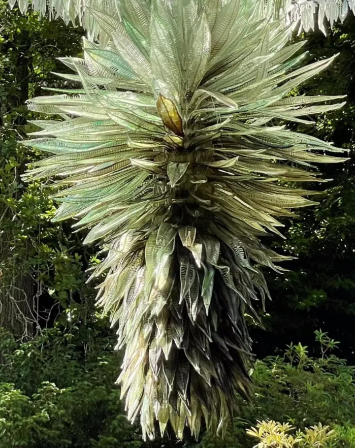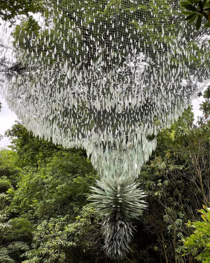 摒弃宏大叙事与潜在破坏,转向谦卑的、融入当地的生态艺术。例如,John Grade Studio(约翰·格雷德艺术创作室)在英国皇家植物园丘园韦克赫斯特分园的艺术作品《伊斯拉》,这件直径12米的巨型雕塑悬于山谷,以哥伦比亚安第斯山脉的“帕拉莫”高海拔生态系统为灵感,6000个铸件组成植物形态装置,雨天更会垂直分离互动,将艺术、科技与保护真正融合。